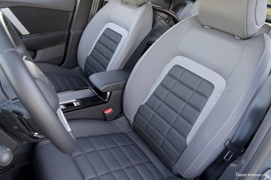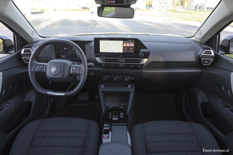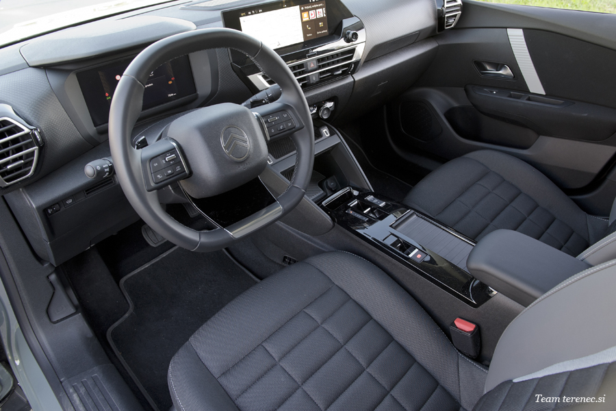 Glavna filozofija Citroëna za C4 je, da potnikom prinese največ udobja kar se le da. Sedeži so res udobni (Advances Comfort), široki in dajejo občutek, kot da bi sedeli na kakšnem udobnem kavču. Prednja sedeža je mogoče po potrebi ogrevati. Vožnja lahko traja, traja, in ne občutimo potrebe, da bi se zaustavili ali pretegnili noge. Sedeži so iz tkanine in na voljo v treh barvah, kar poživi temno notranjost. Armatura je po večini v črni barvi, le okoli zračnikov za zrak so dodali sive dodatke. Trikraki volan je iz usnje, za njim je voznikov digitalni prikazovalnik v velikosti sedem palcev, kateremu bi lahko v prihodnosti malo posodobili grafiko, a kljub temu trenutno nudi dober pregled vseh potrebnih informacij. Na sredini armature je pozicioniran velik 10-palčni zaslon na dotik My Citroën Drive Plus, ki omogoča različne informacije, kot so trenutno stanje na cestah, cene goriv in še kaj.