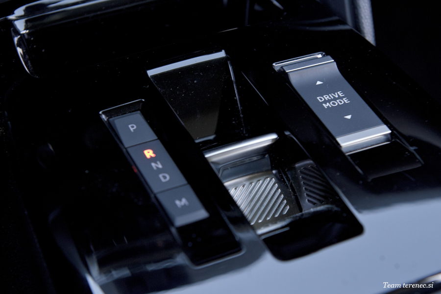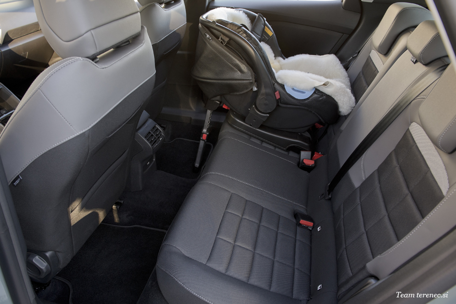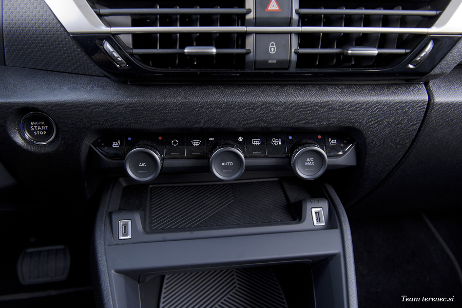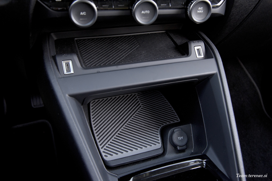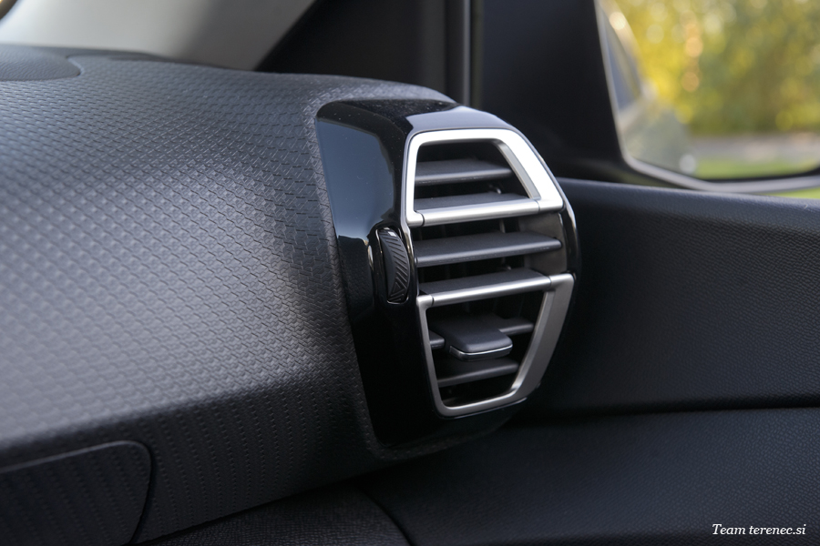 Gumbi za upravljanje dvopodročne klimatske naprave so klasični, pod njimi pa lahko najdemo prostor za odlaganje in brezžično polnjenje pametnih telefonov. Sredinska konzola med sedežema je iz svetleče plastike, ker se vidi vsak odtis prsta in prah, ki se na njej hitro nabere. Tu najdemo gumb za izbiranje voznega programa, elektronsko prestavni gumb in električno parkirno zavoro. V predalček se lahko vstavi dve pol-litrski plastenki ali kaj drugega. Pod naslonom za roke je večji prostor za odlaganje predmetov. Na zadnji klopi je prostora dovolj za noge. Po potrebi se lahko peljejo tudi trije, saj sredinski potnik na tleh nima tako visokega grebena, kot pri nekaterih znamkah.