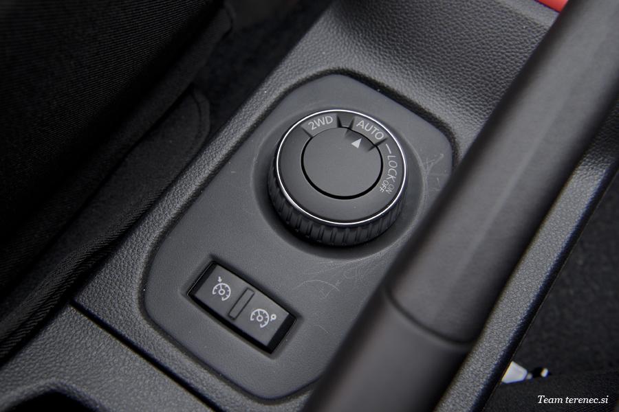Na sredinski konzoli imamo nameščen vrtljiv gumb, s katerim lahko nastavljamo način pogona. Če ga zavrtimo skrajno levo imamo pogon samo na prva kolesa, z vrtljajem v desno ga prestavimo v avtomatski način, kjer vsi senzorji ves čas nadzorujejo oprijem koles s podlago in po potrebi samodejno prenesejo moč na zadnja kolesa. Ko gumb obrnemo še bolj v desno, pa zapremo diferencial in moč se porazdeli na vsa kolesa v razmerju 50:50. Zadnja opcija je namenjena za počasno vožnjo po zahtevnih terenih.