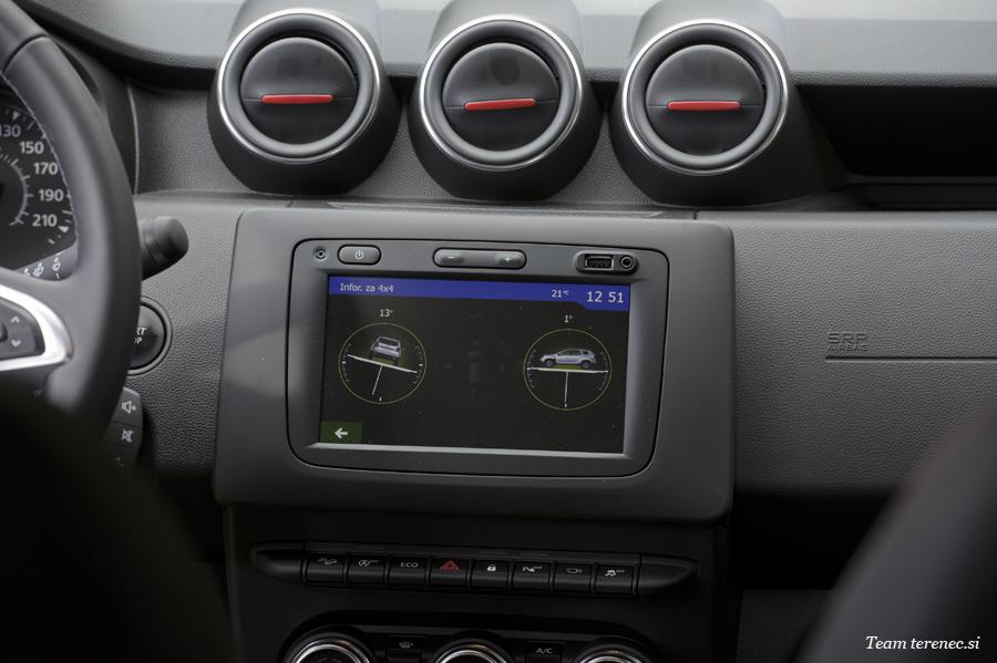 Kdor želi spremljati podatke o naklonu vozila lahko uporabi informacijski program, ki prikaže nagib vozila ali pa za lažjo orientacijo izkoristi digitalni kompas. Duster se na cesti počuti precej bolj domače, njegov pravi dom pa so brezpotja. Njegov vstopni kot je 30 in izstopni 33 stopinj. Ker ni prevelik terenec, je precej okreten in ga lahko z lahkoto obrnemo na »vsaki« kozji poti.