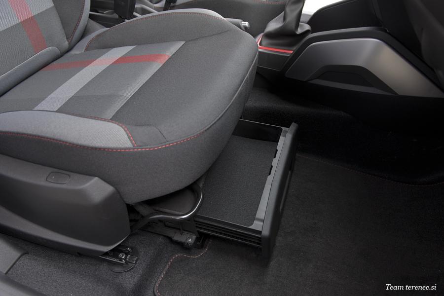 Pod zaslon so v ravni črti, ki spominja na klavirsko tipkovnico, namestili večje število gumbov. Tu se upravlja način vožnje ECO-Normal, lahko se izklopi parkirne senzorje in sistem Start&Stop, sistem ESP ter sistem za spust po klancu navzdol, izbira se način pogleda med kamerami, na koncu je še gumb za uporabo utripalk v sili. Klima je po novem avtomatska in za upravljanje te, uporabimo tri okrogle, več funkcijske gumbe. Pogled na bele voznikove števce je prijeten in potovalni računalnik je postal večji, enostavnejši za uporabo. Voznik si lahko volan prilagodi po višini in globini. Spredaj sta sedeža bolj čvrsta in ne več tako mehka kot včasih, s čimer so dosegli več udobja. Volan je nov, štirikrak, oblečen v usnje, ki je prav prijetno na otip, a nas je zmotilo v nočnem času, da ta ni osvetljen oz. tipke, ki so na volanu.
