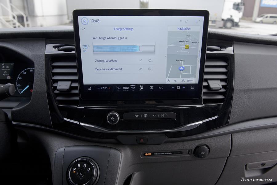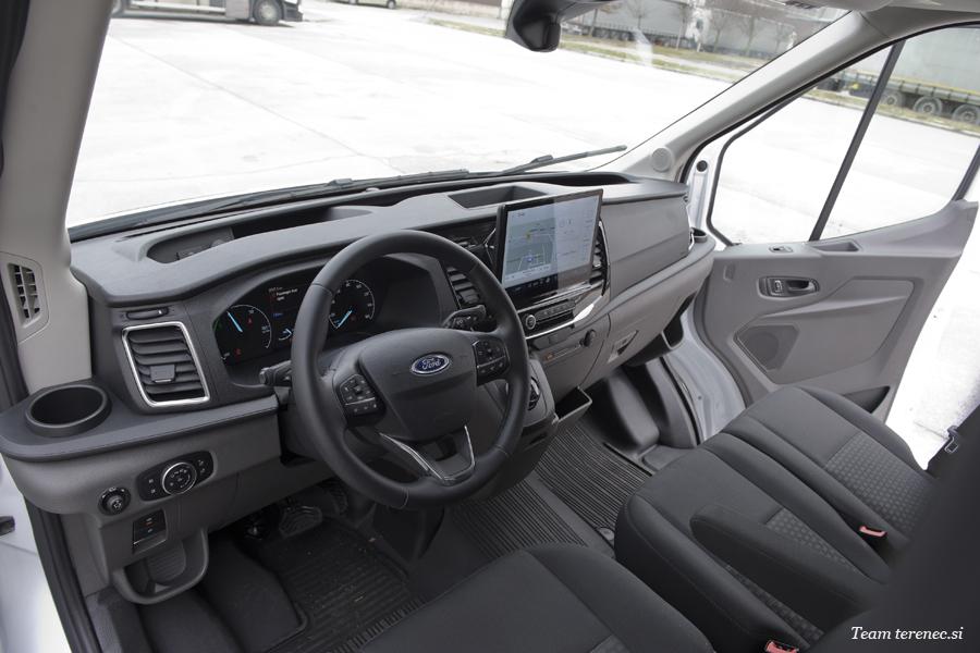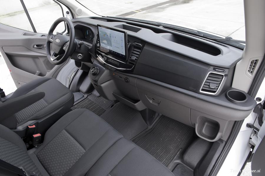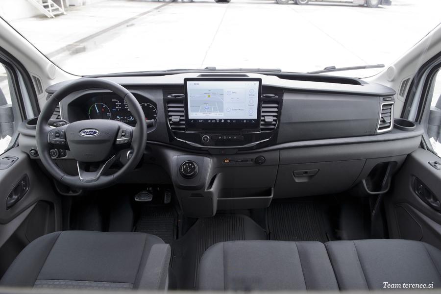 Transit že ima eno najlepših notranjosti velikih kombijev, ki je zgrajena s kakovostnimi materiali in sodobnim dizajnom, ki je korak pred večino tekmecev. E-Transit prihaja skupaj z najnovejšim informacijsko, razvedrilnim sistemom Sync 4, ki doda ogromen 12-palčni osrednji zaslon na dotik. S tem je Ford še bolj prehitel večino konkurence, ko gre za sodobne funkcije povezljivosti.