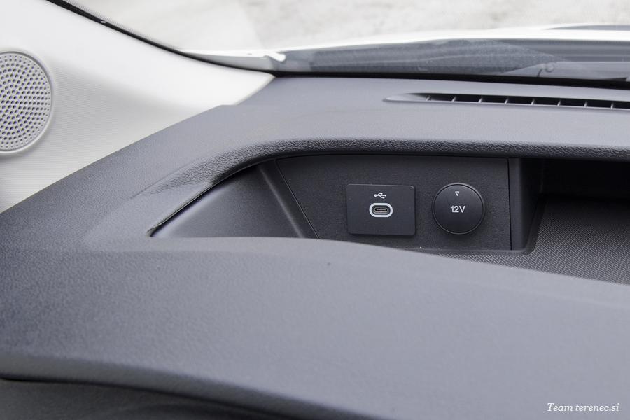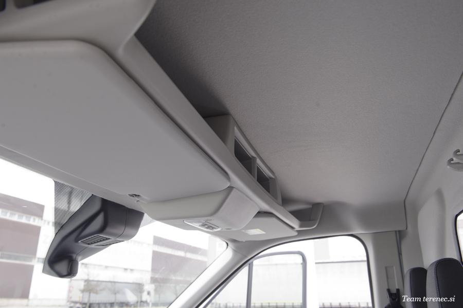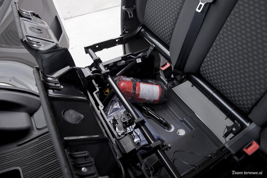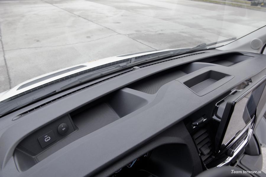 Prostora za odlaganje je res veliko in se nam ne bo zgodilo, da česa nebi mogli kam odložiti. Zgornji predel armature so razdelili v štiri različne prekate in s tem poskrbeli, da se nam stvari ne vozijo iz ene strani na drugo. Nad voznikovimi prikazovalniki, v prostoru za odlaganje imamo dve vtičnici. Žepi vrat so prostorni in uporabni. Pod stropom je še nameščena polica, ki pa je namenjena nižjim predmetom. Še en večji prostor se skriva pod sovoznikovima sedežema oziroma klopjo. Tam lahko shranimo snežne verige, gasilni aparat, prvo pomoč, kabel za polnjenje vozila in še marsikaj.