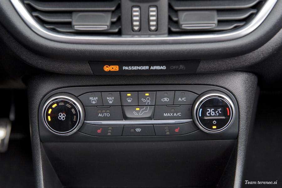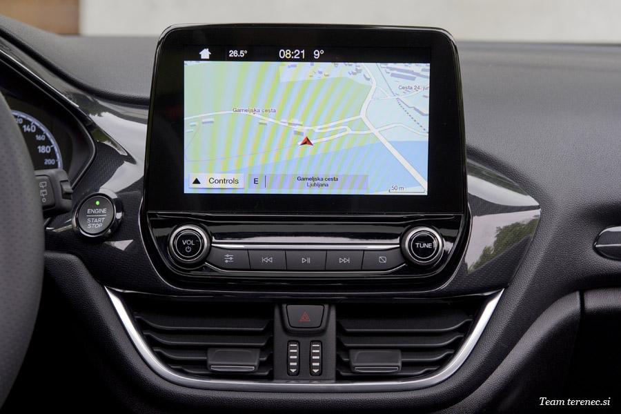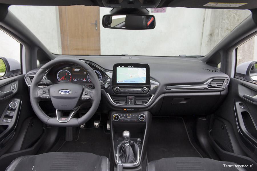 Fiesta ST je športnik na zunaj in prav nič manj znotraj. Ko se spogledamo z notranjostjo, najprej vidimo športne sedeže Recaro, ki so kljub športnemu duhu precej udobni, na volanu napis rdeč napis ST in prestavno ročico z rdečimi številkami. Za bolj svetlo notranjost poskrbi veliko strešno okno, ki se ga lahko tudi odpre. Na vrhu armature zeva barvni zaslon na dotik v velikosti 8 palcev ali z drugimi besedami premerom 20,3 centimetrov. Sistem je zadnje generacije SYNC3, ki je povezljiv z Apple CarPlay in Andorid Auto. Žal meniji še niso poslovenjeni in če bodo kdaj je pod vprašajem. Zvočni sistem je B&O, ki premore 10 zvočnikov. Volan je trikraki in multifunkcijski, oblečen v usnje. Klimatsko napravo so ločili od digitalnega zaslona in jo upravljamo z mehanskimi gumbi. Za vstop in zagon motorja ne potrebujemo ključa, dovolj je, da ga imam v bližini, torej v  žepu ali torbici.