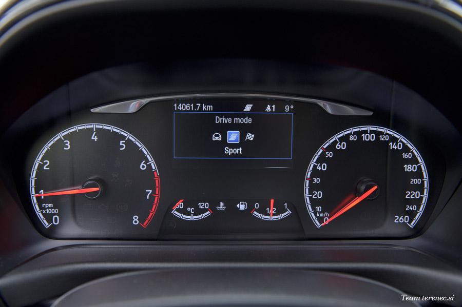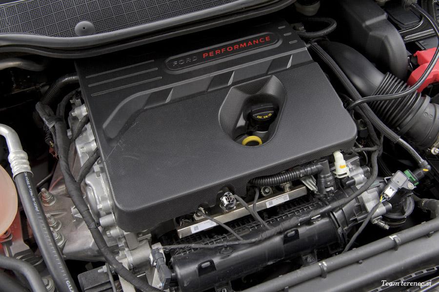Ford je v svojega športnega malčka vgradil izjemno zmogljiv trivaljnik prostornine 1.5-litra. Kljub trem valjem ima motor okroglih 200 »konjev« in 290 Nm navora že pri 1.750 vrtljajih. Iz mesta hitro poskoči in iz nič do sto potrebuje 6,5 sekund. Motor ima glede na maso vozila  dovolj moči, da bo poskrbel za povišan srčni utrip. V vseh načinih vožnje je živahen in poskočen. Menjalnik je ročni, šeststopenjski in ima kratke hode. Trivaljnik na prevožen kilometer izpusti 136 g emisij CO2. V mestu se lahko uporablja sistem Start&Stop. Na testu smo prevozili okoli 560 kilometrov in vožnja je bila zelo raznolika. Ko smo imeli težjo nogo, smo beležili porabo nad 7,3 litrov, pri umirjeni vožnji pa 6,3 litrov.