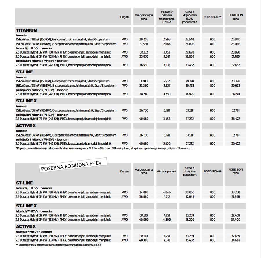 1 Kuga Plug-in Hybrid – homologirani izpusti CO2 55–71 g/km, homologirana poraba goriva 2,8–3,9 l/100 km, homologirani doseg z izključno električnim pogonom 60–68 km po WLTP Euro 6e-bis.