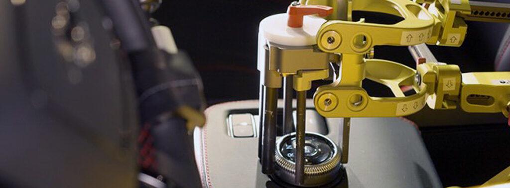 Noge robotskega testnega voznika segajo do stopalk za pospeševanje, zaviranje in upravljanje s sklopko, z eno roko lahko prestavlja, z drugo pa zažene in ustavi motor.