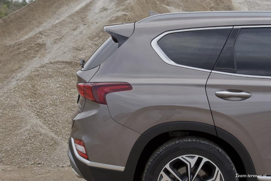 Santa Fe ni več tako sramežljiv, saj je maska precej bolj privlačna in agresivna, ki se zdaj bolje poda velikemu športnemu terencu. Nekaj potez je povzel od Kone, ki so drugačne, bolj impresivne od ostalih konkurentov. Reže za zrak motorja so oblikovane v kaskadni obliki, bolj grobega stila. Luči so ločili, ozke dnevne LED luči umestili v zgornji del in nekoliko nižje še večje LED žaromete v kombinaciji navadnih smernikov. Ko ga pogledamo iz strani, nedvomno opazimo, da gre za impozantnega športnega terenca. Velike površine so razbili z dodanim kromom okoli oken in na spodnjem delu vrat. Zadnja stekla so dodatno zatemnili, na strehi izstopa antena v obliki morske plavuti. Zadaj so vidne atraktivne 3D LED luči, ki naredijo Santa Fe-ja popolnega. Medtem, ko se celota bohoti pa so izpušne cevi pri tem vozilu preveč nežne. Po našem mnenju bi morali vgraditi bolj impresivne izpušne cevi, na vsako stran po eno večjo, podolgovato, da bi zadostilo. Platišča so lahko v treh velikostih in štirih različnih oblikah. Med barvami karoserije lahko izbiramo med desetimi barvami, med katerimi so nekatere kovinske in druge mineralne. V barvnem naboru je kar nekaj novih, zanimivih izbir.