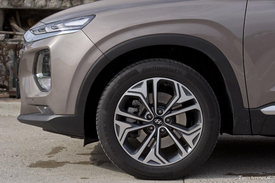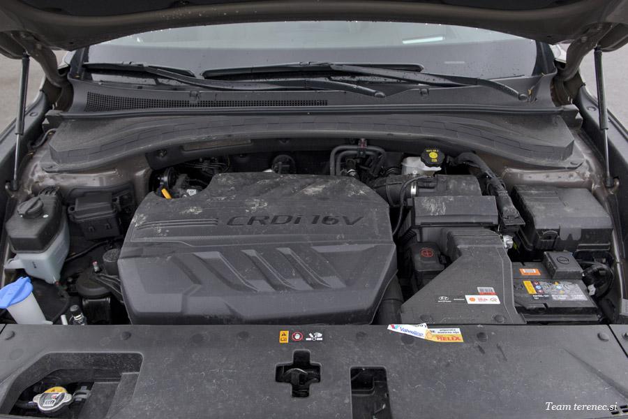 Testni Santa Fe je imel pod pokrovom motor večje prostornine 2.2-litra. Na voljo je še nekoliko šibkejši 2.0 litrski motor s 150 konji in 400 Nm navora. Naš je imel 200 konjev in 440Nm navora, ki ga je moč izkoristiti med 1.750 in 2.750 vrtljaji. Novost pri Santa Fe-ju je popolnoma nov samodejni osem stopenjski menjalnik, ki dela izvrstno. V osnovi motor upravljamo s šest stopenjskim ročnim menjalnikom, a toplo priporočamo, da ob nakupu novega Santa Fe-ja izberete samodejnega, ker bo s tem poraba nižja in vožnja udobnejša. Pri prejšnjem testnem modelu, opremljenim z ročnim menjalnikom, smo morali v mestu ves čas prestavljati, ker ni bilo prijetno. Najvišja hitrost, ki jo lahko dosežemo po tehničnih podatkih je 205 km/h in iz mesta do sto potrebuje 9,8 sekund. Motor spada v razred Euro6c in na prevožen kilometer izpusti od 160 do 165g emisij CO2. Motorju so sicer dodali AdBlue. Glede na to, da je SantaFe večji in težji v primerjavi s prejšnjim modelom, se mu je poraba znižala za dober liter. Na testu se je poraba gibala pri 7,3 litrih, kar je solidno za dobri dve toni težko vozilo. Pri hitrosti 150km/h z uporabo tempomata se je poraba dvignila na 8,6 litrov, kar je še vedno sprejemljivo.