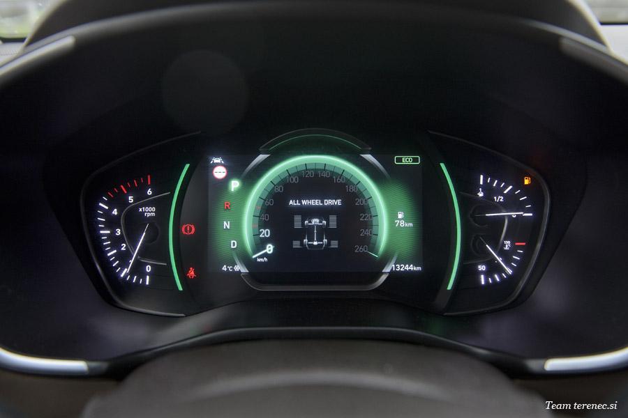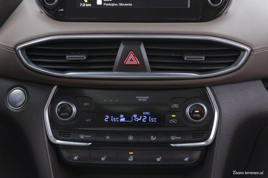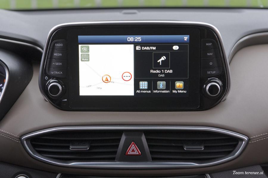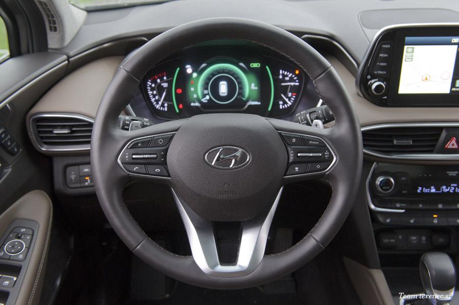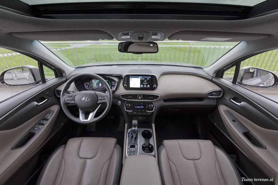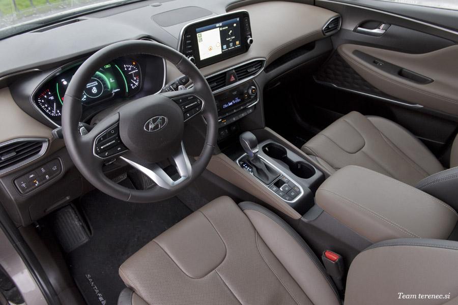Notranjost nam postreže z dvema velikima zaslonoma, prvi je 7-palčni voznikov prikazovalnik, ki je obdan še z dvema analognima. Na sredini armature izstopa velik 8-palčni zaslon na dotik. Za lažje in hitrejše upravljanje so ohranili nekaj hitrih, fizičnih gumbov. Zaslon je odziven, podpira sistem Apple CarPlay in Android Auto. Ima navigacijo TomTom s sedem letno brezplačno naročnino na storitve Live. V tem obdobju lahko sedemkrat brezplačno nadgradimo kartografijo. Voznikov informativni zaslon spreminja barve prikazovalnika glede na izbiro voznega programa. Vsi pomembnejši podatki so se nam prikazovali na vetrobranskemu steklu in ne več na projekcijskem zaslonu, ki se po navadi prožijo iz armature. Za vrhunski zvok poskrbi zvočni sistem Krell. Precejšen del armature je oblečen v usnje. Nismo si znali razložiti čemu služi manjši odlagalni prostor v armaturi nad sovoznikovim predalom, saj je po našem mnenju neuporaben in služi le nabiranju prahu. Običajno lahko v žepe stranskih vrat odložimo kakšno plastenko vode, a je tu ne moremo kljub veliki notranjosti Santa Fe-ja,.