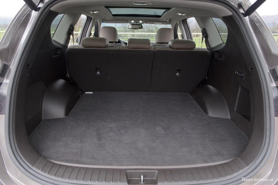 Pri vsakodnevni rabi nam prtljažnik nudi 625 lit prostornine, s podrtjem zadnje klopi se ga poveča na 1.695 lit. Zadnja klop se podre le v dveh delih 60:40 in ne v treh 40:20:40 kot smo pričakovali. Pod prtljažnim dnom je večji odlagalni prostor, kamor se lahko pospravi prtljažni rolo. Rob prtljažnika je zelo visok, s tem pa je oteženo natovarjanje težjih predmetov. Na stranici prtljažnika je vgrajena 12V vtičnica in gumba za hitro podrtje zadnje klopi po delih.
