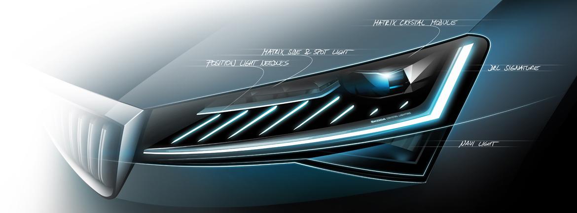 Oblikovalska skica celostnih matričnih LED-žarometov prikazuje zgradbo tega inovativnega sistema žarometov, ki ga sestavljajo LED-modul za zasenčene in dolge luči ter še tri LED-komore za dolge luči, na ohišju pa ima napis “ŠKODA Crystal Lighting”. Tanka LED-svetlobna letev služi kot smernik ter za dnevno in pozicijsko luč. Nad njo so razporejene tanke LED-igle, ki so sestavni del nove animirane funkcije Coming/Leaving Home. Ob odpiranju ali zapiranju vozila ta funkcija po vnaprej določeni koreografiji avtomatsko vključi in izključi elemente sprednjih in zadnjih luči.