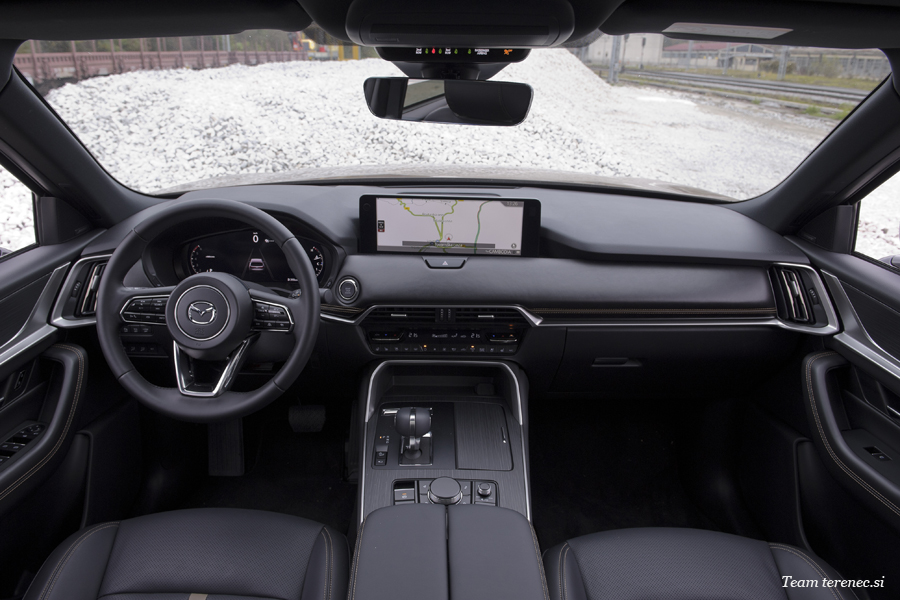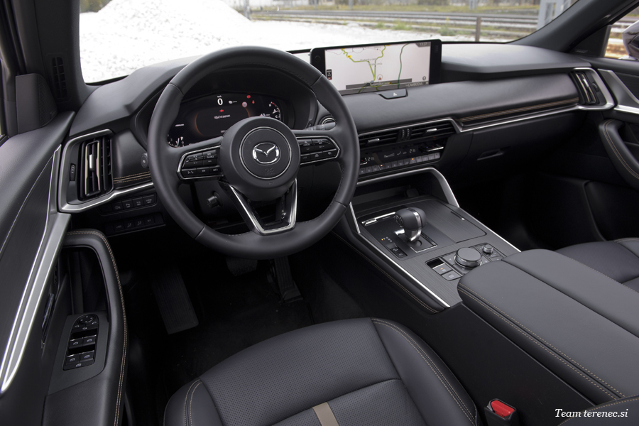 Mazda je znana po tem, da imajo vsi njeni modeli notranjost precej dodelano in to že od najmanjšega modela do največjega. CX-80 prinese v notranjosti veliko prefinjenosti, uporabnost in predvsem prostornost. Vsi vgrajeni materiali so res kakovostni. Testni CX-80 je imel sedeže oblečene v črno usnje, obrobljene s kontrastnimi zlatimi šivi in prav tako je bila prednji del armaturne plošče oblečeno v usnje. Pri samih materialih so se oblikovalci, inženirji usmerili k ravnovesju med estetiko in kvalitetnimi materiali. Ambientalna osvetlitev naredi notranjost še bolj prefinjeno in poveča občutek prostornosti.