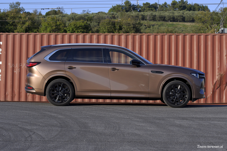 Mazda CX-80 jasno sledi smernicam oblikovalske filozofije »Kodo Soul of Motion«, ki od vsega začetka podarjajo občutek gibanja tudi takrat ko vozilo stoji. Skozi karoserijo lahko zaznamo tekoče linije, elegantnost in minimalističnost ter dodane detajle. Kljub svoji velikosti ima dinamične in elegantne poteze, a ne pretirane agresivnosti, kot smo dan danes navajeni pri konkurenci. CX-80 ima veliko masko hladilnika v črni barvi in obdano s kromom, tanjše LED žaromete, ki se zlijejo s masko in dajejo vozilu sodoben izgled. Stranska linija se počasi spušča od spredaj proti zadku, medtem ko s kromiranim okvirjem stranskih oken in strešnimi letvami poudarja premijski izgled. Obut je v 20-palčna črna platišča, ki poudarjajo elegantnost.