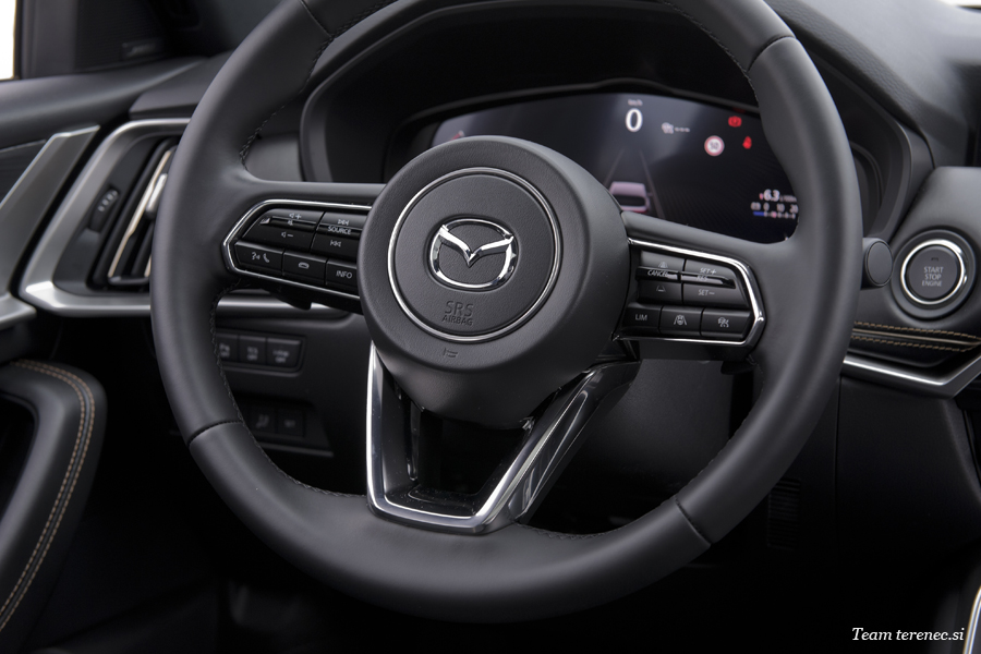 Mazda je pri tem posebno pozornost namenila nevtralni legi in stabilnosti med zavijanjem, kar omogoča zanesljivo vodenje tudi pri višjih hitrostih. CX-80 se izkaže kot zanesljiv spremljevalec pri dolgih vožnjah na avtocesti z nizkim hrupom v kabini, dobra zvočna izolacija in stabilna smerna lega zagotavljajo relaksirano izkušnjo pri višjih hitrostih. Mazda je pri CX-80 odstranila zadnji stabilizacijski drog (v primerjavi s CX-60), kar vpliva na bolj gladko blaženje manjših neenakosti, medtem ko se ohranja stabilnost pri večjih hitrostih.Mazda ima tri vozne programe (Sport, Normal, Off-road), ki prilagodijo karakteristike avtomobila, vendar spremembe niso drastične; Sport način bolj “pritisne” na plin in zadrži vrtljaje, brez občutnega preskokov v dinamiki.