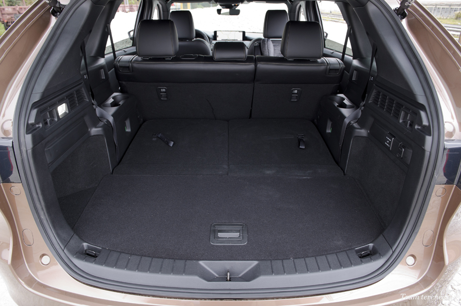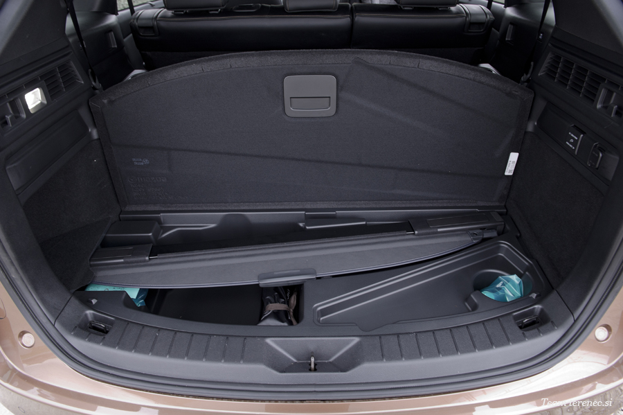 V primeru, da ne uporabimo tretje vrste ima CX-80 prostora za 687 litrov in lahko poveča na 1.971 litrov v primeru, da še podremo drugo vrsto. V primeru, da je družina številčna in uporabimo vse tri vrste za prevoz sedmih potnikov, pa nam ostane še 258 litrov prostora. Drugače je prtljažno dno popolnoma ravno in prtljažni prostor precej uporaben. Ne smemo pozabiti omeniti, da so pri Mazdi poskrbeli, da lahko ob neuporabi prtljažnega zastirka (zavesice) pospravimo pod prtljažnim dnom, kjer so pripravili mesto za shranjevanje le tega. V kolikor jo koristimo, pa imamo nekaj več prostora za shranjevanje drugih, večjih predmetov.