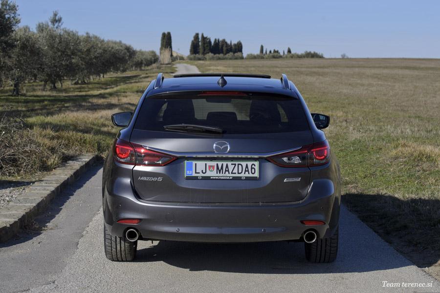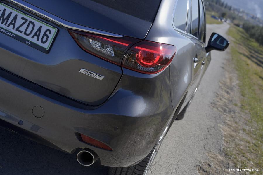 Prenovljena Mazda6 karavan ima sedaj bolj refeneriran prednji in zadnji odbijač, novo kromirane reže za zrak motorja, na novo oblikovana velika aluminijasta platišča in v najvišjem nivoju opreme še bolj kakovostne materiale. Naša je bila v barvi Titanium Flash sive in si upamo trditi, da ta barva paše karavanski izvedenki in posebna Mazdina rdeča manjšim izvedenkam, a ima vsak svoj okus.
