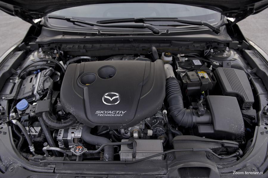 Inženirji se pri Mazdi niso odločili za manjšanje prostornine motorjev, ampak jih znova in znova nadgradijo, izboljšajo. Motorji Skyactiv ponujajo veliko zmogljivosti in obenem gospodarnost. Naša šestica je imela pod pokrovom turbo dizelski 2,2-litrski motor, ki po novem ponuja kar 184 konjev in izjemnih 445 Nm navora pri 2.000 vrtljajih na minuto. Zaradi novih, strožjih predpisov glede izpustov, so dizelskemu motorju dodali se dodatek AdBlue. Motor smo upravljali s 6-stopenjskim samodejnim menjalnikom, ki pa ni več tako sodoben, dodelan glede na konkurenco, ki že vgrajujejo do 9-stopenjske menjalnike. Naš ni bil tako hiter, a kljub temu je lepo prestavljal in poskrbel za udobno vožnjo. Karavan je izdelan za udobno vožnjo in ne divjanje. Glede na to, da Mazda6 tehta 1.690 kilogramov smo na odprti cesti dosegli 5,8 litrov porabe in po mestu za 6,4 litrov več.