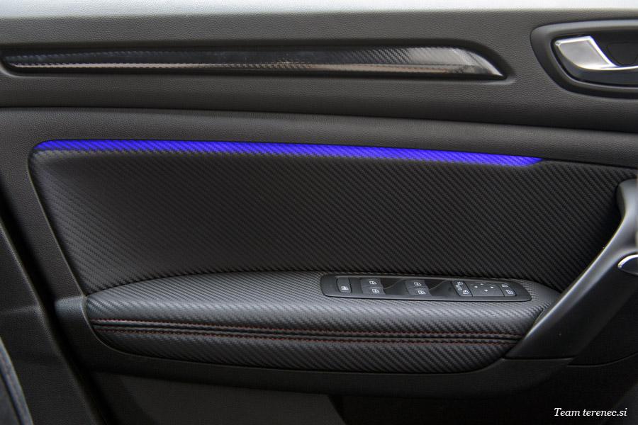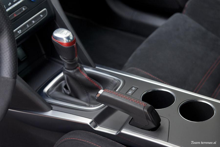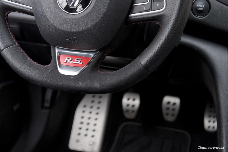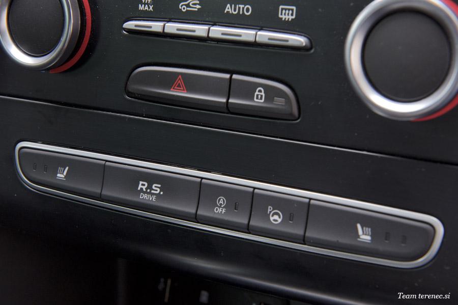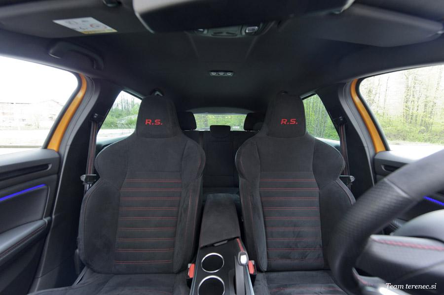 Notranjost R.S-a se precej razlikuje od klasičnega. Res, da je osnova enaka, tu predvsem izstopata sprednja sportna sedeža, ki te pošteno objameta, volan je v kombinaciji usnja in alkantare. Alkantara na volanu nas ni prepričala. Na volan so dodali še rdeč emblem R.S., prestavna ročica je obrobljena z rdečo, vsi šivi so v rdeči barvi in v prednjih vzglavnikih je izvezen emblem R.S. Vse stopalke so iz aluminija za še bolj športen videz.