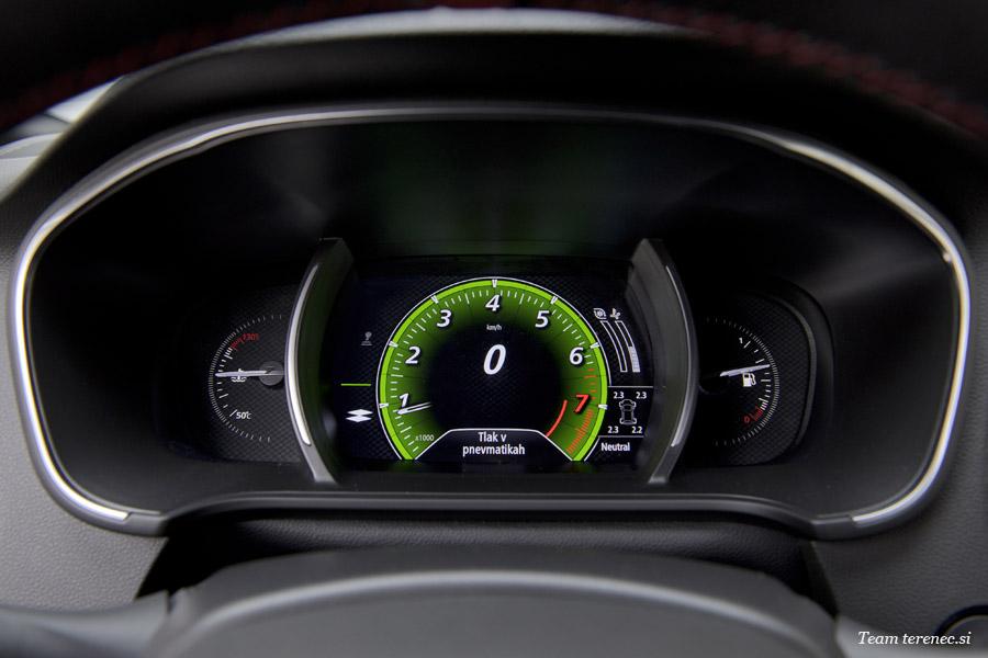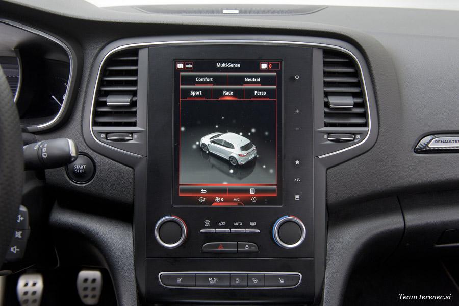 Pospeševanje nas ni pustilo hladne in glede na razpoloženje smo si menjali načine vožnje Confort, Neutral, Sport, Race in Personal. V programu Race se izključi ESP, kar pa pride v poštev kadar smo res dobro vozniki in smo z Meganom na progi. Glede na izbran program se spreminjajo barve, grafična podoba na voznikovih števcih in v velikem sredinskem zaslonu. K takemu športnemu avtu bi se podal še kakšen bolj športen zvok, ki bi prihajal iz zadka. Ne smemo biti preveč kritični, saj se je na trenutek zaslišal tudi kakšen pok, ko sta dodobra ogreta izpušni sistem in motor pognala v višje vrtljaje.