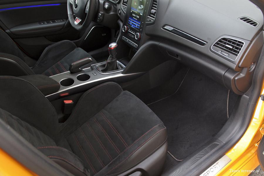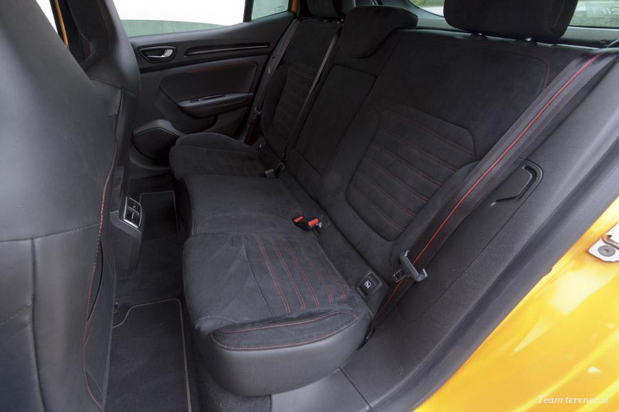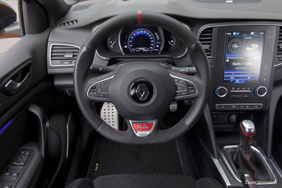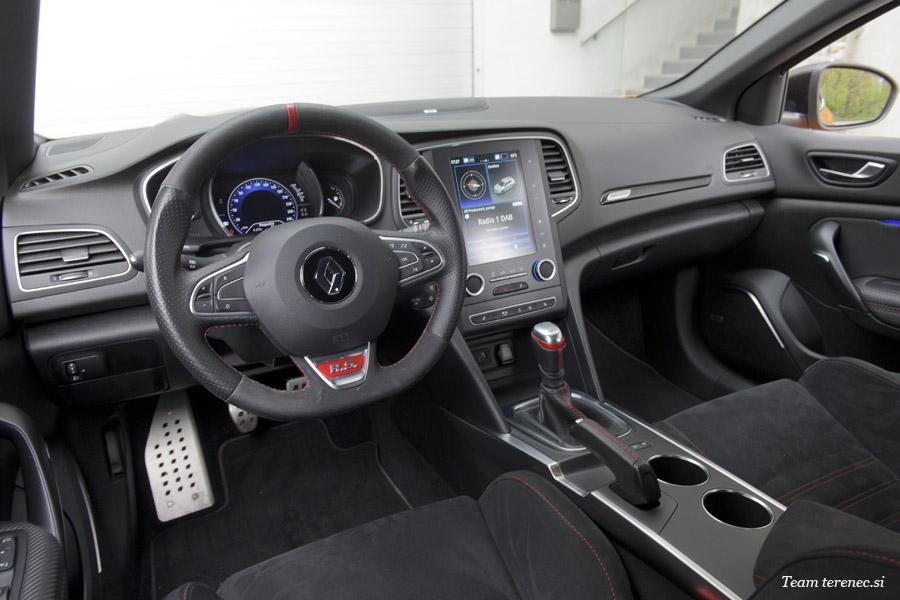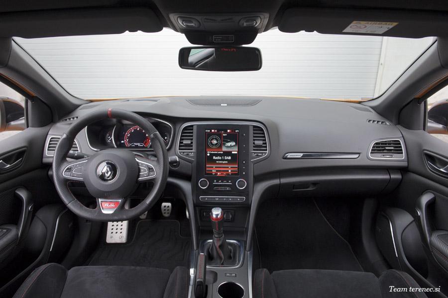 Na sredini je viden že poznan multimedijski sistem R-Link 2, s 7 palčnim zaslonom na dotik. Na zaslonu se upravlja večina sistemov, spremlja navigacijo in posluša radio v DAB tehnologiji. Sistem je že nekoliko za časom in deluje precej počasi. Povežemo se lahko z aplikacijama Android Auto in Apple CarPlay. Samodejna klima je dvopodročna, ročna zavora je klasična pri ročnem menjalniku, pri samodejnem menjalniku je elektronska. Voznik si lahko svoj sedalni položaj dobro prilagodi in s tem zagotovi čim več udobja, ki ga lahko ponudi športni sedež. Kljub temu, da je novi Megane bolj prijazen do družin, gre še vedno za športnika in se ne sme pričakovati velikega udobja. Med vožnjo po slabšem cestišču lahko potniki nekoliko »poskakujejo«. Zadaj je prostora za dve odrasli osebi, ki nimata preveč dolgih nog. Na klopi je poskrbljeno za pritrdišča dveh otroških sedežev. Klop je ohranila svojo uporabnost in jo lahko podremo v celoti ali samo delno v razmerju 60:40. Prtljažnik nudi pri normalni uporabi 384 lit volumna, lahko ga povečamo na 1.247 litrov.