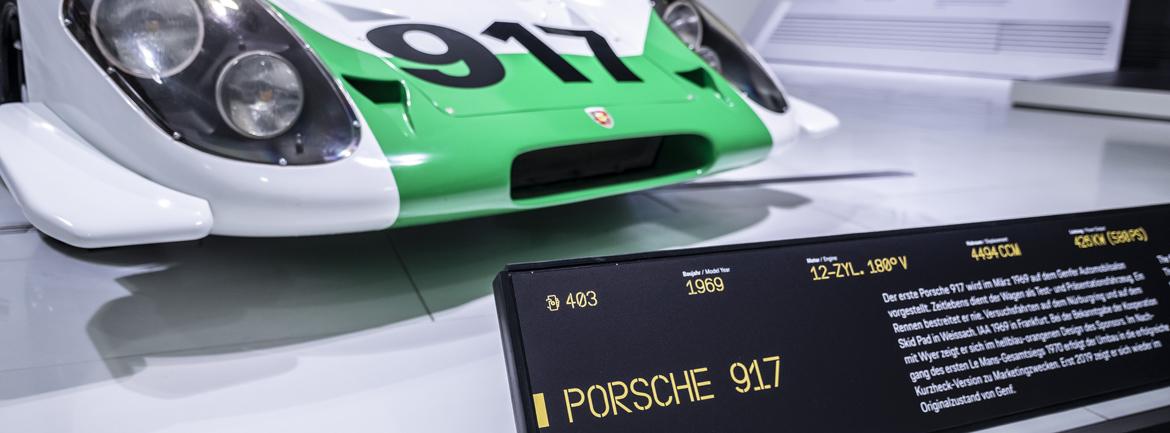 Kot športni avtomobil skupine 4 je bil model 917 zasnovan posebej za 24 ur Le Mansa in za svetovno prvenstvo znamk. Številka ena je nastala leta 1969 kot prvi od skupno 25 primerkov, ki so bili potrebni za homologacijo. Model 917-001 označuje začetek neprekosljivo uspešne serije in zato predstavlja vrhunec posebne razstave. Muzejski mehaniki, nekdanji tehniki in inženirji iz Zuffenhausna in Weissacha, zgodovinski arhiv družbe Porsche AG in partnerska podjetja so več kot leto dni sodelovali pri projektu njegove rekonstrukcije. Zdaj je nared v takšnem stanju, kakršnega so 12. marca 1969 svetovni javnosti predstavili na ženevskem avtomobilskem salonu.
