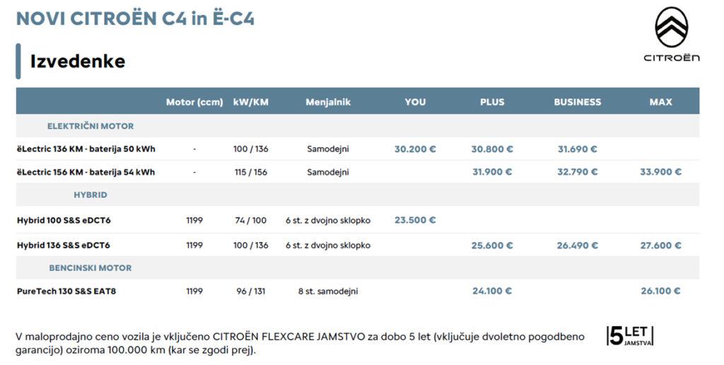• Citroën potrjuje svojo zavezanost preprosti in cenovno dostopni elektrifikaciji. Poleg električnih pogonskih sklopov, ki so dokazali svojo primernost in konkurenčnost, uvaja tudi hibridne izvedenke, ki niso le učinkovite temveč tudi vsestransko uporabne. Na voljo tudi izvedenke s klasičnim bencinskim motorjem.
