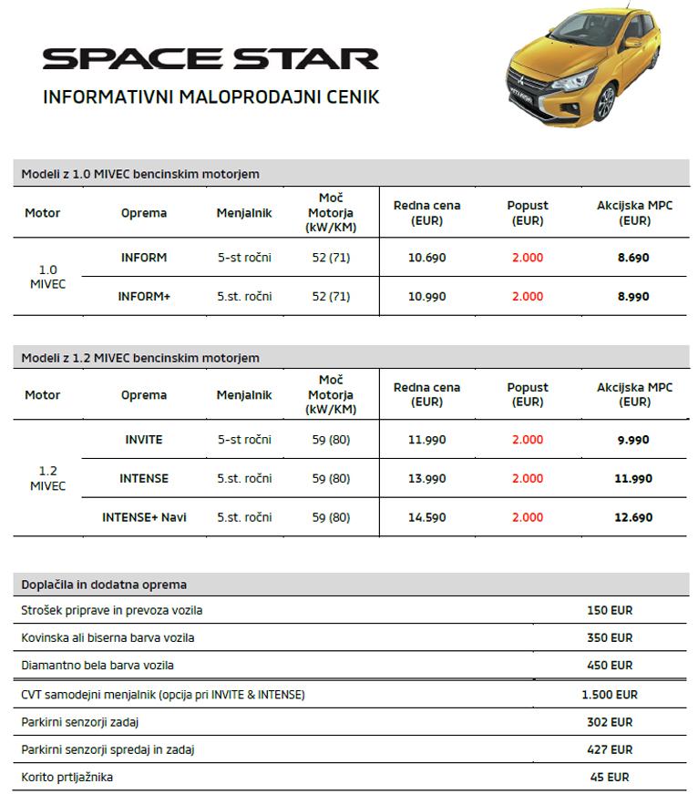 Vozne lastnosti Space Stara odlikuje okretnost (rajdni krog le 4,6 metra) in odlična preglednost, zato je suveren na vseh mestnih ulicah in parkiriščih. Energična zmogljivost učinkovitih 1,0 in 1,2 litrskih motorjev z MIVEC tehnologijo, varčna poraba (po WLTP meritvah znaša kombinirana le 5,0l/100km) ter tovarniška garancija 5 let je dovolj argumentov za to, da vas nova zvezda mesta zapelje in na vas pusti Mitsubishi pečat.