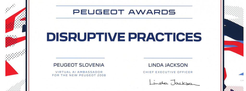 - Znamka Peugeot je na globalni ravni izvedla izziv imenovan PEUGEOT AWARDS, v katerem so sodelovale vse ekipe uvoznikov in podružnic znamke po vsem svetu. Mednarodna žirija, sestavljena iz izvršnega odbora in vodij blagovnih znamk Peugeota, je za najboljši projekt preteklega leta izbrala slovenski projekt Peugeot 2008 – AI Virtualni Ambasador. Peugeot Slovenija je s tem projektom osvojil prestižno nagrado Peugeot Awards 2024 v kategoriji Disruptive Practices, kar potrjuje inovativnost in prebojnost slovenskega tima ter izjemno priznanje s strani vodstva znamke Peugeot na globalni ravni.