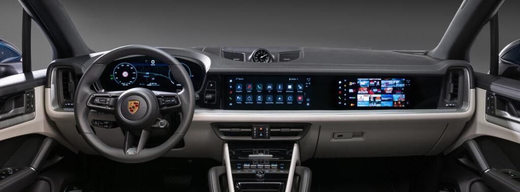 Visokoločljivostni 12,3-palčni osrednji zaslon je nadzorni center sistema Porsche Communication Management (PCM). Voznik tu kot običajno najde možnosti upravljanja številnih voznih in komfortnih funkcij, serijsko spletno navigacijo in multimedijske funkcije. Popolnoma nov v Porsche Cayennu je opcijski integrirani 10,9 palčni zaslon na sovoznikovi strani. Sovoznik lahko prek dodatnega zaslona na dotik razbremeni voznika, saj ima možnost upravljanja navigacije ali izbire medijske storitve. Posebna folija zagotavlja, da voznik s svojega sedeža na ta zaslon ne vidi. Sovoznik lahko zato na tem zaslonu tudi med vožnjo pretaka videovsebine.