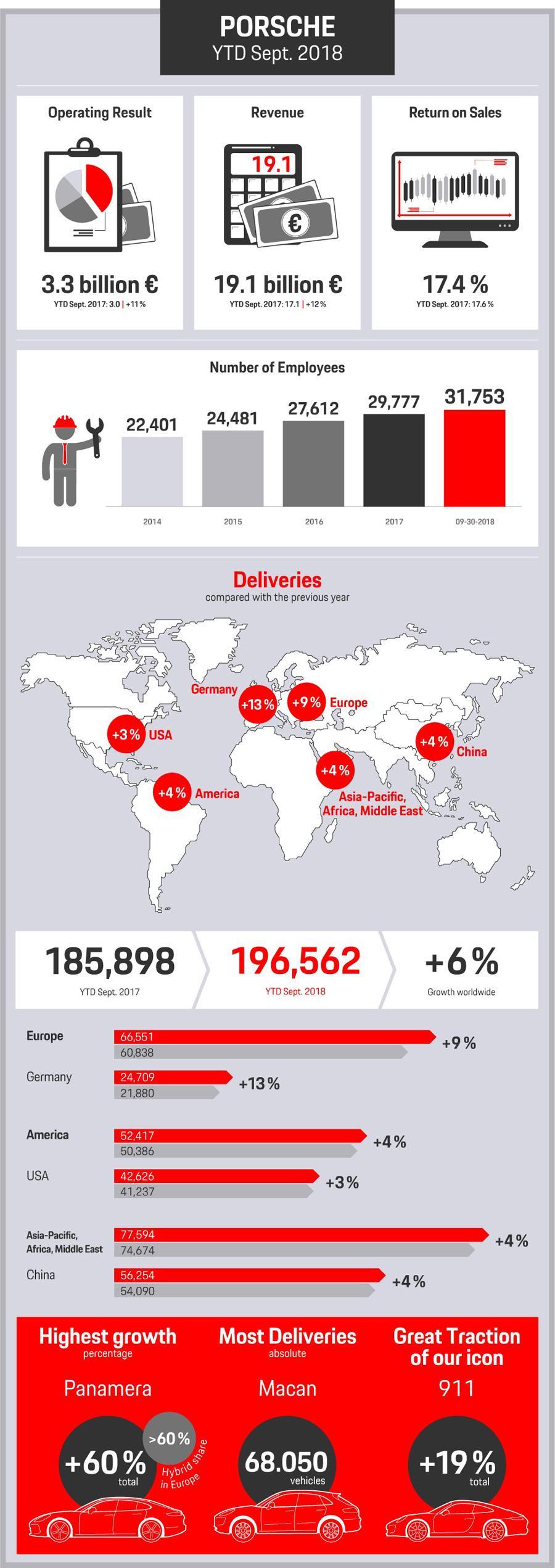 Uspešno tretje četrtletje: v prvih devetih mesecih leta 2018 je družba Porsche AG še dodatno povečala poslovni izid iz poslovanja, promet, prodajo končnim kupcem in število zaposlenih. Poslovni izid iz poslovanja se je v primerjavi z enakim obdobjem lanskega leta povečal za enajst odstotkov in je znašal 3,3 milijarde evrov, promet pa je bil večji za 12 odstotkov in je dosegel vrednost 19,1 milijarde evrov. Operativni donos iz poslovanja je znašal 17,4 odstotka. Prodaja končnim kup-cem se je dvignila za šest odstotkov, kar pomeni, da je podjetje do konca septembra dobavilo 196.562 vozil. Število zaposlenih je zraslo za osem odstotkov in je doseglo številko 31.753.