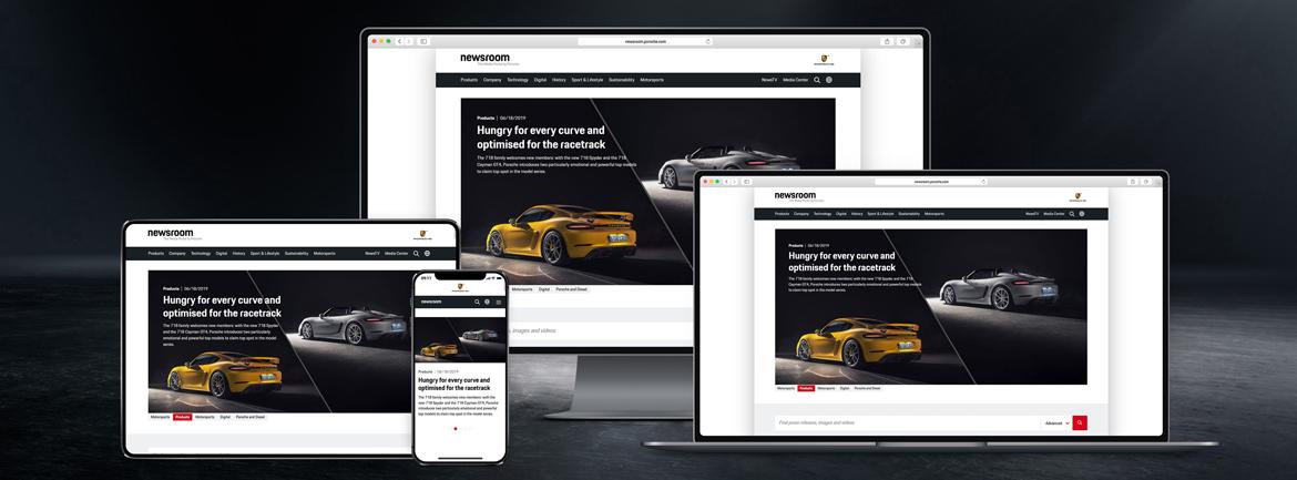 Porsche s povsem prenovljenim spletnim Newsroomom daje na razpolago še večjo in še bolj pestro informacijsko ponudbo. Spletna stran newsroom.porsche.com je od leta 2014 osrednja vstopna točka za novinarje, blogerje in spletno skupnost. Deluje kot korporativni blog, platforma za družbene medije in središče za prenos datotek v enem. Uporabniki lahko tam najdejo široko ponudbo besedil, slik in videov – ki so vedno aktualni, pregledni in dostopni brez gesel. Spletni magazin v nemškem, angleškem, kitajskem, ruskem in španskem jeziku poleg tega bralce vsakodnevno seznanja z novicami in poglobljenimi vsebinami.