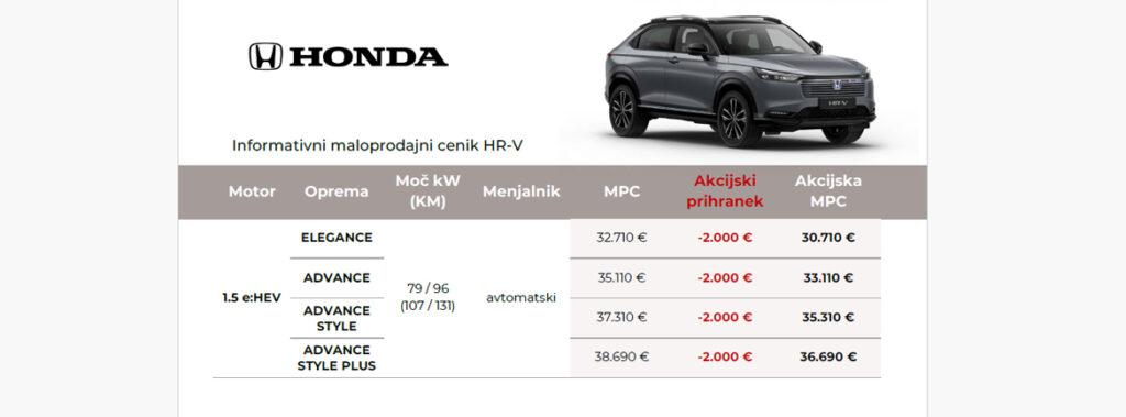 Kupcem je od danes naprej na voljo odlična, osvežena Honda HR-V, ki ohranja Hondine magične sedeže za še večjo uporabnost vozila v različne namene in tako zadosti širokemu krogu slovenskih kupcev. Izbirajo lahko med štirimi različnimi nivoji oprem, sedmini različnimi barvami in pri petih barvah karoserije tudi možnost dvobarvne karoserije. Ustaljeni barvni lestvici so se pridružile še tri nove barve: zelena Sage, modra Seabed in siva Urban.