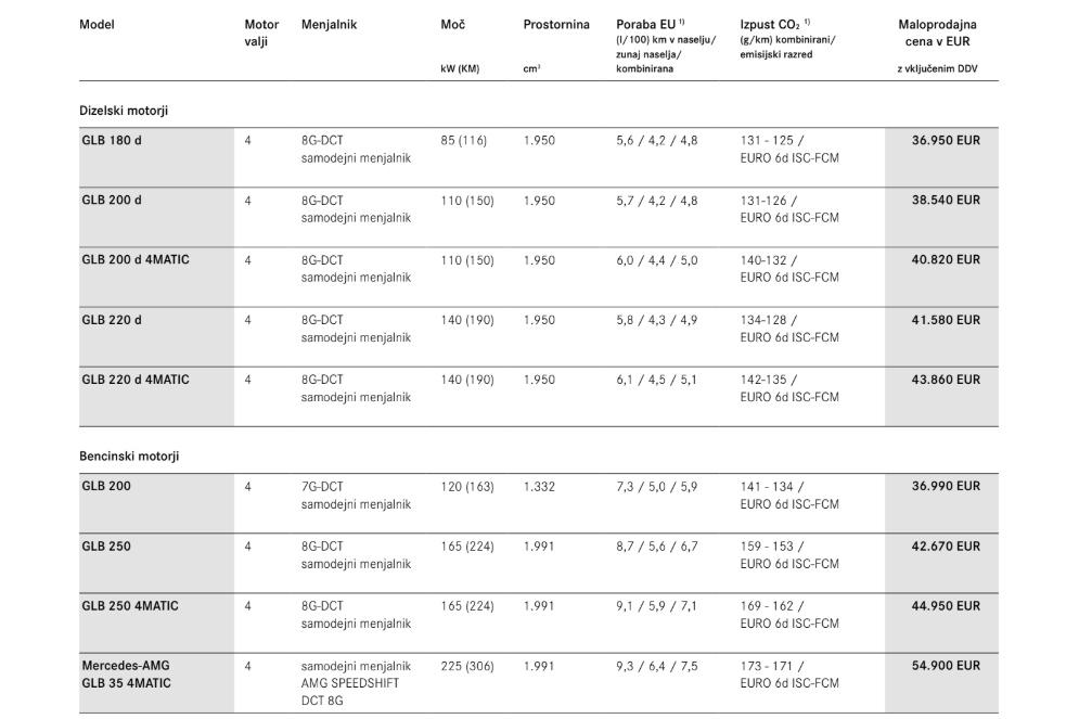 - Mogočne dimenzije kratkih previsov in oblika, zasnovana za terensko vožnjo, kot tudi opcijski štirikolesni pogon 4MATIC in posebne terenske luči, ki pri majhni hitrost pomagajo prepoznavati ovire neposredno pred vozilom – novi Mercedes-Benz GLB je vsestransko športno terensko vozilo. In prostoren družinski avtomobil: je prvo vozilo Mercedes-Benz v tem segmentu, ki je lahko po želji opremljeno s sedmimi sedeži. Dva sedeža v tretji vrsti lahko uporabljajo osebe, ki v višino merijo do 1,68 metra. Z zmogljivimi in učinkovitimi štirivaljnimi motorji, najnovejšimi sistemi za pomoč pri vožnji s podporo vozniku, intuitivno krmiljenim informacijsko-razvedrilnim sistemom MBUX, vključno s celovitim komfortnim aktiviranjem ENERGIZING Comfort, ima novi družinski član (dolžina/širina/višina: 4634/1834/1658[1] milimetrov) vse prednosti aktualne generacije vozil kompaktnega razreda družbe Mercedes-Benz. Na voljo je tudi: Novi Mercedes-AMG GLB 35 4MATIC (kombinirana poraba goriva: 7,6–7,5 l/100 km; kombinirane emisije CO2: 173–171 g/km)[2] kot edinstven model v segmentu kompaktnih športnih terenskih vozil.
