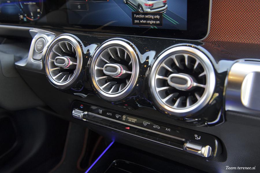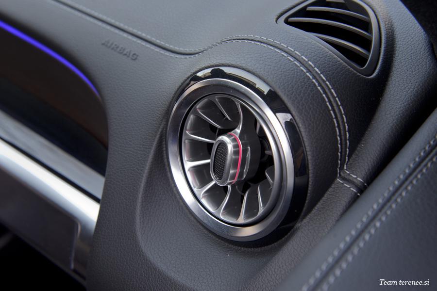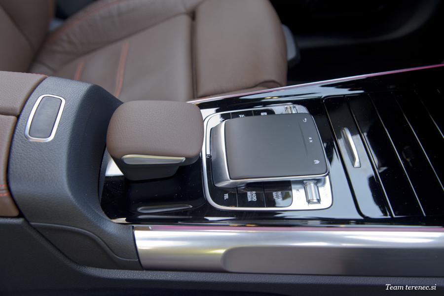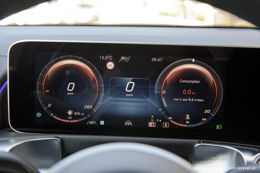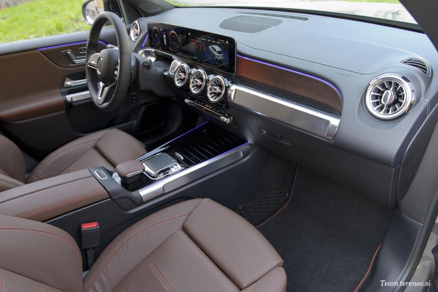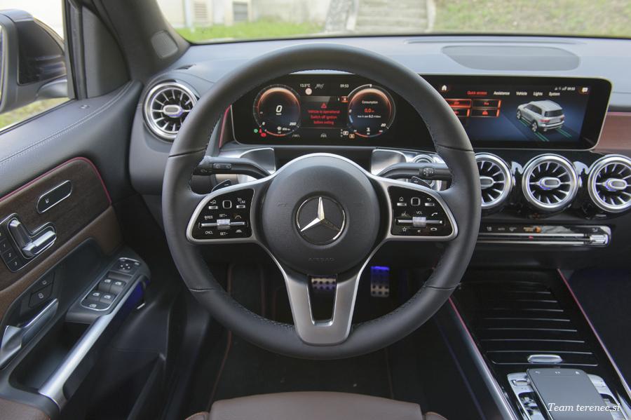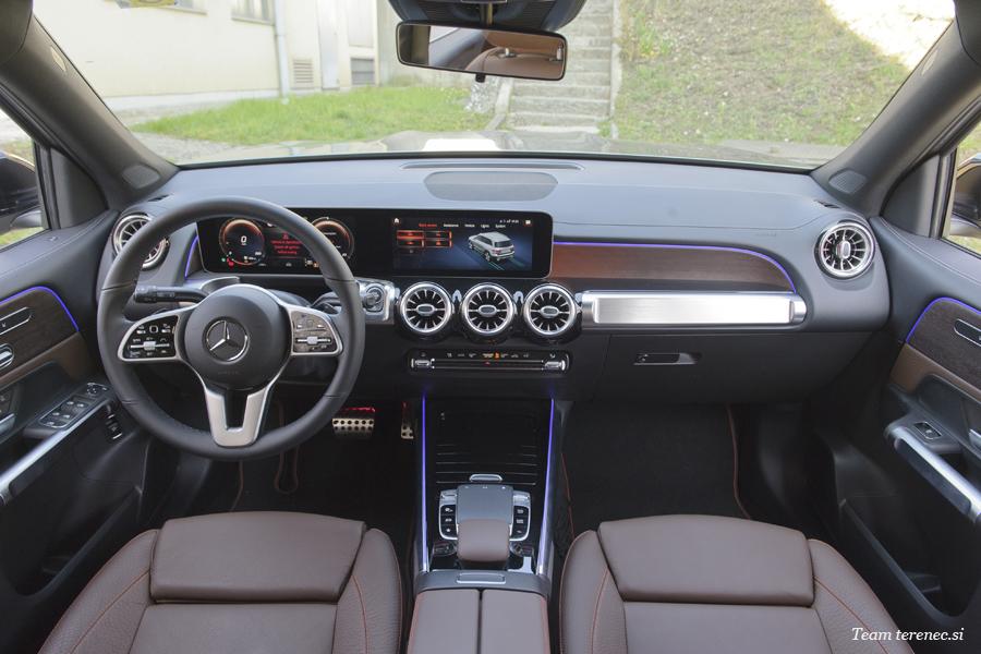 Armaturna plošča je sestavljena iz enega kosa z izrezi na voznikovem in sovoznikovem prostoru. Voznika v kokpitu pričakuje širok zaslon s krmiljenjem in prikazovalnikom preko sistema MBUX (Mercedes-Benz User Experience). Novost je terenski cevast element v aluminijasti izvedbi na sovoznikovi strani armaturne plošče. Pod okroglimi prezračevalnimi šobami poleg cevastega elementa je enota za upravljanje klimatske naprave, katere gumbi ustvarjajo vtis, da so bili rezkani iz aluminijastega valja.