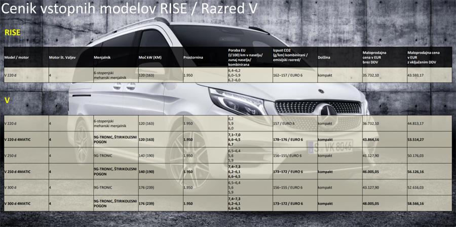 - Leta 2014 se je razred V Mercedes-Benz premierno predstavil s povsem novim pristopom k obliki, profilu vrednot, udobju in varnosti v segmentu enoprostorskih vozil. Koncept je postal prava uspešnica: približno 209.000 prodanih vozil razreda V od vstopa na trg leta 2014, prodajni rekord leta 2018 z okoli 64.000 prodanimi vozili, ena od najmlajših skupin kupcev vozil znamke Mercedes-Benz in uspešna globalna širitev, predvsem v Aziji. Na začetku leta 2019 je Indija postala najnovejši trg za razred V in s tem pomemben člen v enačbi uspeha. Aktualna posodobitev prinaša osvežujoče ozračje v že tako uspešen model. Poudarki vključujejo preoblikovano in izrazito podobo sprednjega dela, uvedbo generacije štirivaljnih dizelskih motorjev OM 654 – pri čemer je V 300 d nova najzmogljivejša pogonska različica s 176 kW (239 KM) (kombinirana poraba goriva 6,1–5,9 l/100 km, kombinirane emisije CO2 161–155 g/km)1 – nov samodejni menjalnik 9G-TRONIC ter varnostne in asistenčne sisteme, ki izpolnjujejo zahteve najnovejšega tehnološkega razvoja, npr. aktivni zavorni asistent.