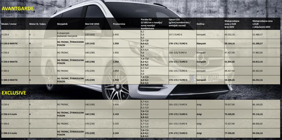 - V 250 d s 140 kW (190 KM), 440 Nm; (kombinirana poraba goriva 6,1–5,9 l/100 km, kombinirane emisije CO2 161–155 g/km)1