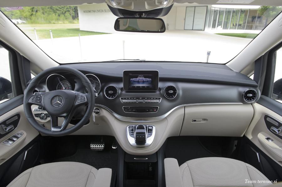 Notranjost prenovljenega razreda V sledi trendu sodobnosti in jasnosti. Preobrazba razreda V se izkazuje z novimi režami za dovod zraka, ki imajo bolj športen turbinski videz, in novimi številčnicami kombiniranega inštrumenta. Prečiščena zasnova kombiniranega inštrumenta voznikom omogoča boljšo preglednost. Novo oblazinjenje in napa usnje v izvedbi Tartufo za opremo podarjata sodobnost in eleganco. Z usnjem Lugano in napa usnjem, ki sta na voljo v črni in svilnato bež barvi, ter črno tkanino Santos je skupno na voljo šest različnih izvedb oblazinjenja v svetlih in temnih barvah. Kot sodoben in eleganten lahko opišemo tudi nov okrasni element v črtastem videzu, ki krasi armaturno ploščo in stranske obloge. Okrasni elementi v videzu klavirskega laka, ebenovine, karbonskih vlaken in brušenega aluminija ostajajo.
