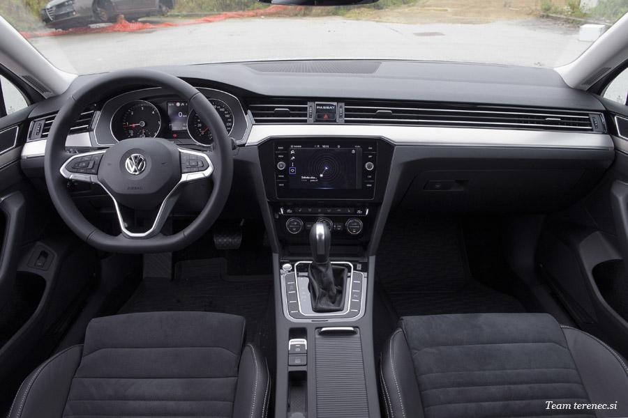 Notranji dizajn – estetika digitalnega sveta. V notranjosti se Passat od predhodnika razlikuje po novih dekorativnih elementih in prevlekah, na novo oblikovanih vratnih oblogah, novi barvi oblazinjenja, novih instrumentih in prav tako novem, pri vseh izvedbah serijskem večfunkcijskem volanu. Kjer je bila na armaturni plošči prej nameščena analogna ura, je zdaj umeščen eleganten, od zadaj osvetljen napis Passat. V sredinski konzoli je odprt, prostoren predal z opcijskim indukcijskim vmesnikom za pametne telefone in ob njem nameščenim osvetljenim USB-priključkom tipa C. Zasloni digitalnega kombiniranega instrumenta in infotainment sistemov se ponoči zlijejo z osvetljenimi tipkami kapacitivnega večfunkcijskega volana in obdajajočo ambientno osvetlitvijo (do 30 barv) v bogato osvetljen, estetsko dovršen in hkrati funkcionalen oder za informacije in upravljanje. Barvni poudarki ambientne osvetlitve se zrcalijo tudi v infotainmentu in digitalnem kombiniranem instrumentu.