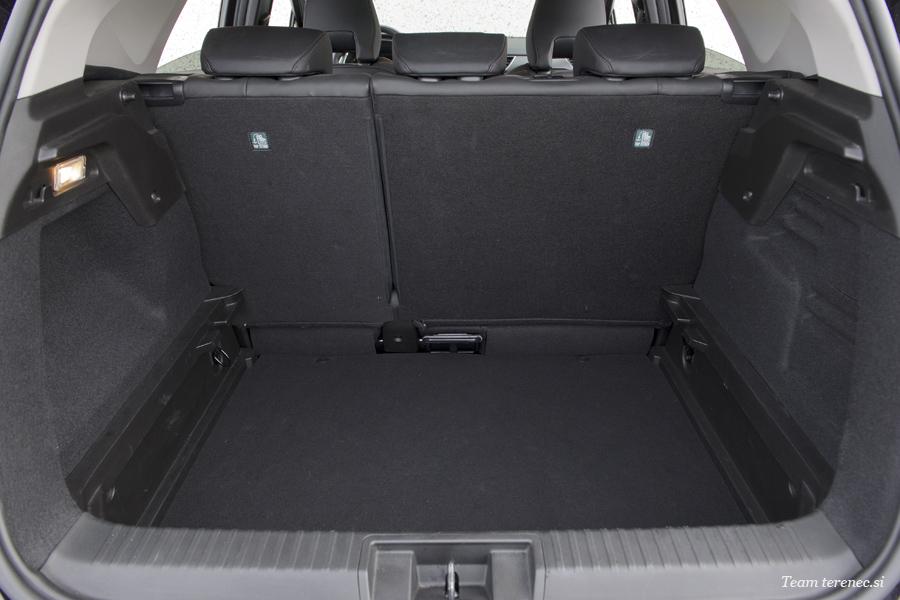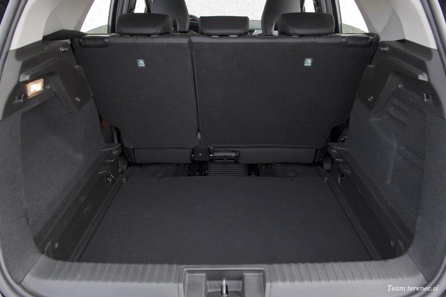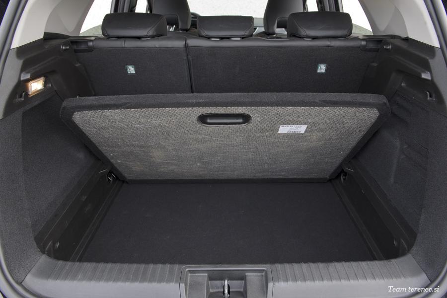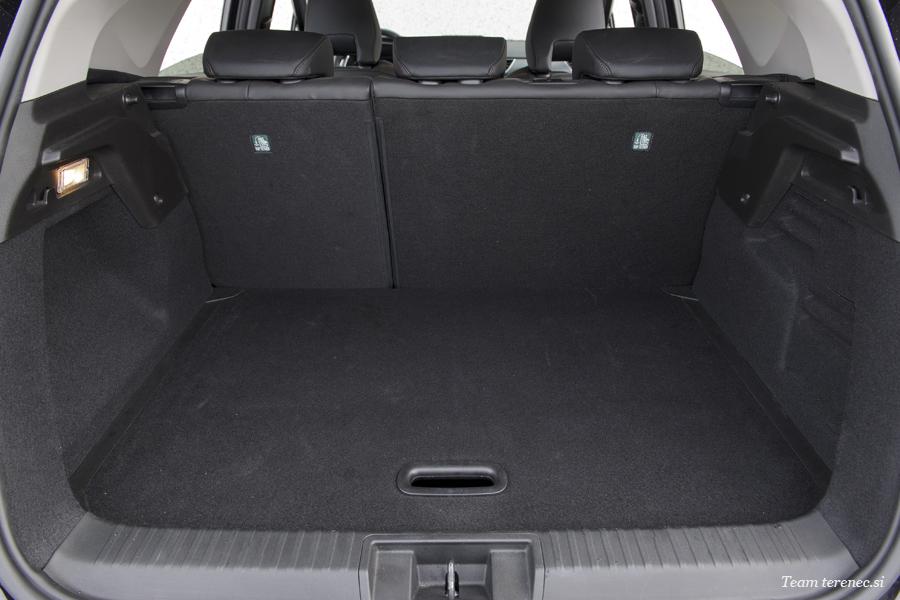 Prtljažni prostor ima 536 litrov prostora in dvojno dno. Zadnjo klop lahko podremo v razmerju 40:60. Posebnost zadnje klopi je, da jo lahko pomikamo naprej in nazaj za 150mm, kar je velika redkost v tem segmentu. Po podrtju zadnje klopi in ob uporabi drugega nivoja dna je prtljažno dno popolnoma ravno. Največja prostornina prtljažnika je 1.275 litrov.