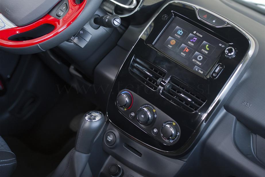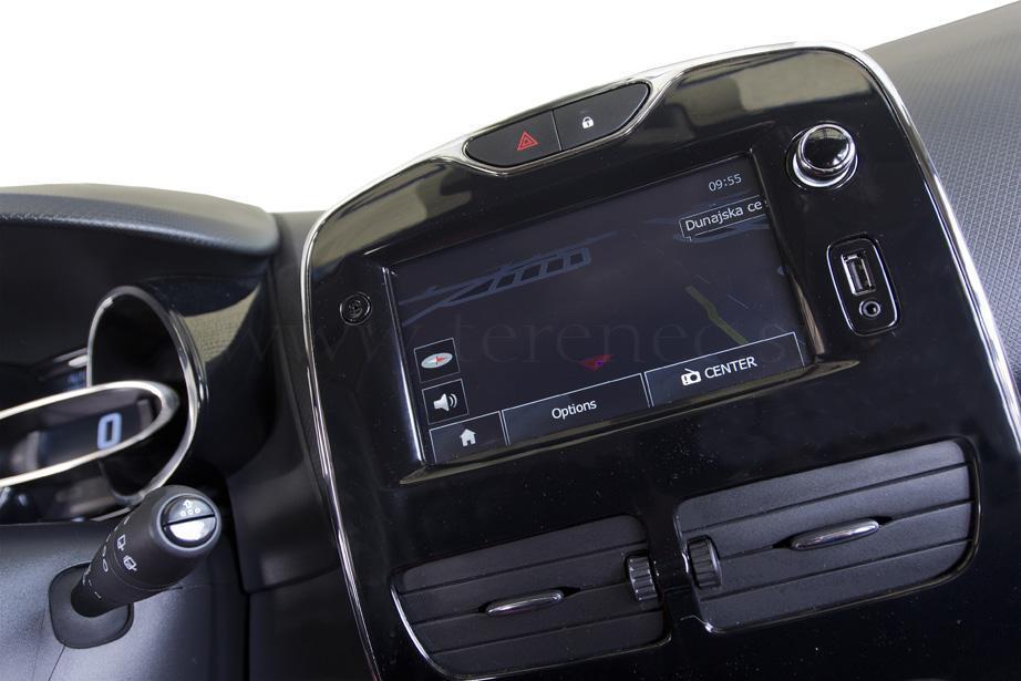 Renault je naredil velik korak pred konkurenco glede sredinske konzole, ki je v Cliu čista, elegantna, nanjo pa niso namestili preštevilnih gumbov za upravljanje raznih multifunkcijskih naprav v vozilu. Vgrajen je velik sedem palični zaslon na dotik, kjer lahko najdemo navigacijski sistem Tom-Tom, sistem za prostoročno telefoniranje, radio, priključek za USB ključek in sistem R-Link, ki lastniku novega Clia omogoča prenos raznih aplikacij (do konca leta 2013 bo na voljo okoli 100 različnih aplikacij). Na volanskem obroču imamo gumba za upravljanje tempomata in omejevalnika hitrosti, ob njemu pa še komande za upravljanje radia.