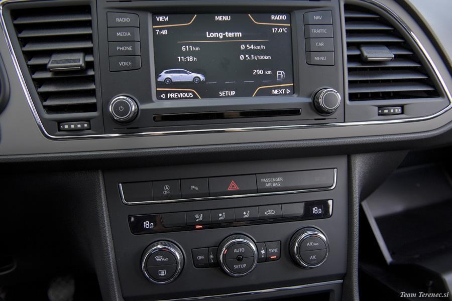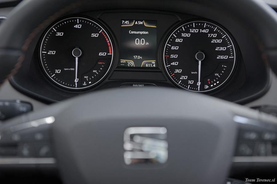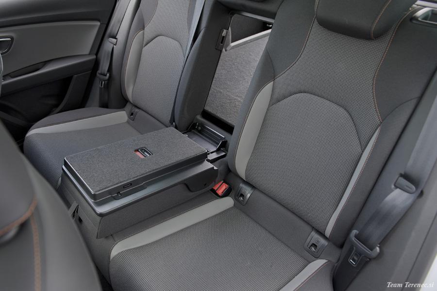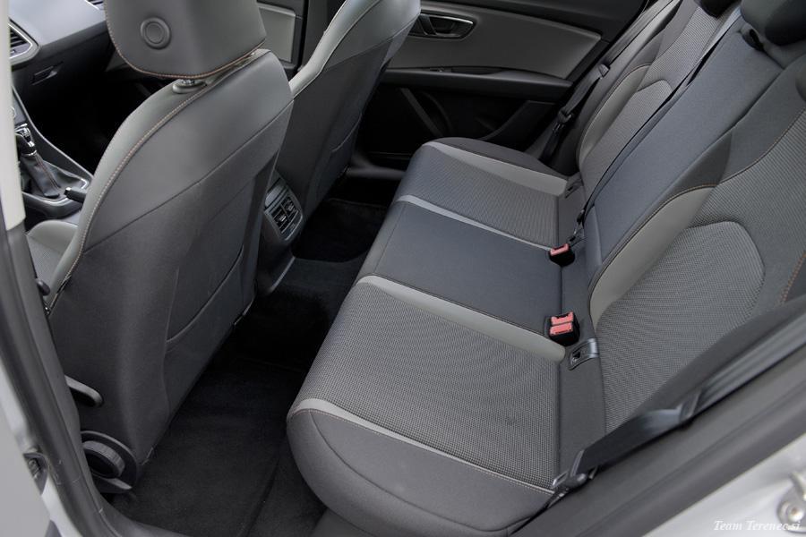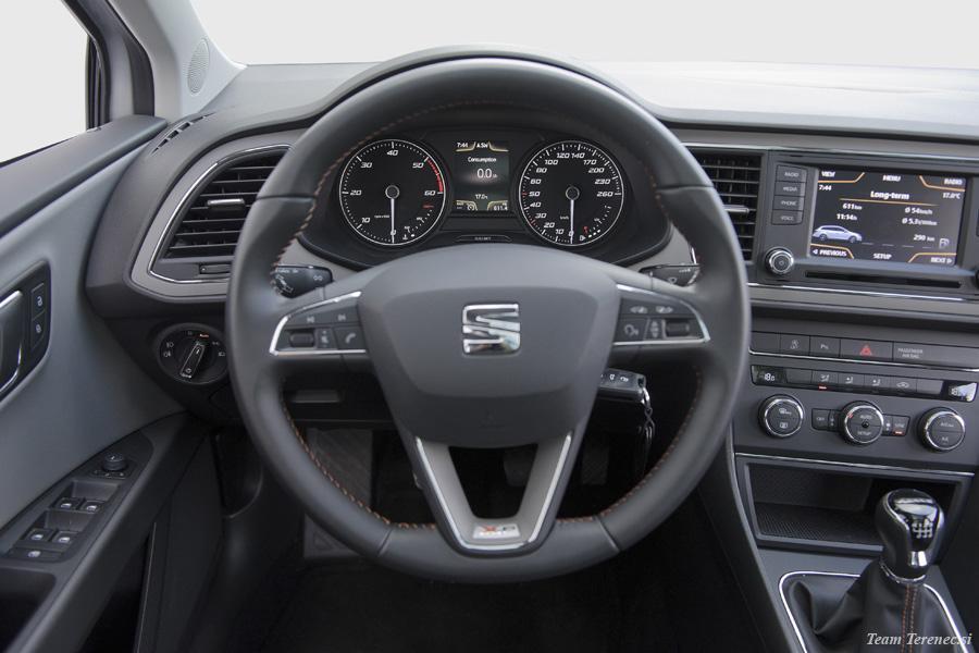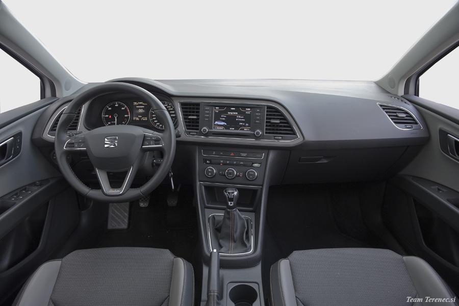 V notranjosti je dovolj prostora za štiri odrasle osebe, v prtljažnem delu pa je prostor zadovoljiv . Prednja sedeža sta športna, a imata zelo dobro ergonomijo, ki jo je na zadnji klopi manj. Voznikov volan je multifunkcijski, oblečen v usnje in z dodanim logotipom X-Perience. Vsi materiali so kvalitetni na dotik, plastika je odporna, vse skupaj pa je dobro sestavljeno brez škripanja. 6,5-palčni zaslon ima dobro ločljivost, preko njega pa lahko upravljamo navigacijo, radio, glasbo z USB ključka ali pa preko bluetootha povežemo pametni telefon. Na zaslonu imamo tudi zavihek iz potovalnega računalnika, ki beleži prevožene kilometre, povprečno porabo in hitrost, koliko kilometrov imamo še do praznega rezervoarja, potovalni čas itd. Osrednji del armature je nekoliko bolj zamaknjen k vozniku, s čimer omogoča lažjo uporabo funkcij in večjo preglednost. Testni Leon je na strehi imel strešno električno okno in električno zaveso, ki smo jo lahko po potrebi zaprli.