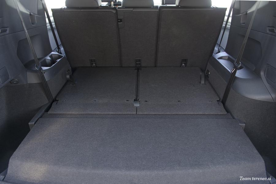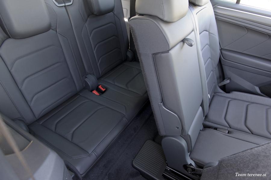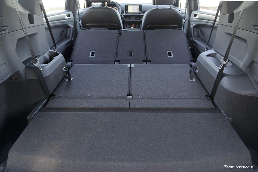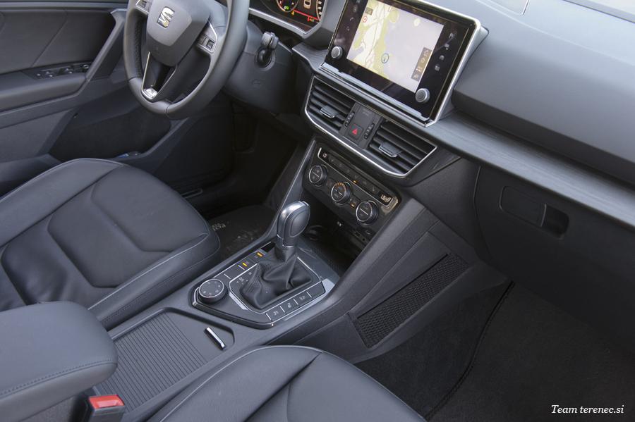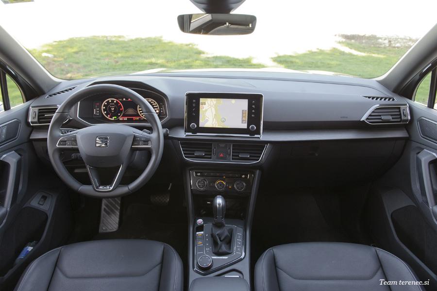 Tarraco je en tistih večjih športnih terencev, ki petim potnikom nudi veliko prostora. Naš testni je imel v prtljažnem prostoru še dva dodatna sedeža za prevoz skupno sedmih potnikov. Zadnja dva sta namenjena otrokom in ne odraslim potnikom, ker ni dovolj prostora za glavo ali noge. Drugo vrsto lahko pomikamo naprej in nazaj za dobrih 15 centimetrov, kar pomeni, da si lahko pri vsakodnevni uporabi prilagodimo sedalni položaj. Usnjeno oblazinjenje daje Tarracu premijski videz in prav tako oba multifunkcijska zaslona. Pred voznikom je velik 10,25-palčni zaslon, ki si ga lahko grafično prilagajamo, na osrednjem delu armature pa je še 8-palčni zaslon na dotik, ki ponuja vse potrebne informacije in sisteme vozniku ter ostalim potnikom. Oba zaslona sta enostavna za uporabo in dobre grafične ločljivosti. Radiju so za doplačilo dodali DAB radijske frekvence in brezžično polnjenje pametnih telefonov. Oba nivoja opreme se ponašata z osmimi zvočniki iz katerih prihaja zadovoljiv zvok. Notranjost je zgrajena precej dobro in se z lahkoto primerja s tekmeci višjega razreda. Določene gumbe, ročice in plastične dele si deli s Tiguanom, a to ni nič novega. S tem racionalizirajo stroške proizvodnje in notranjosti postajajo enake, kar vodi v monotonost. Žal k takšni racionalizaciji proizvodnje stremi vedno več znamk.
