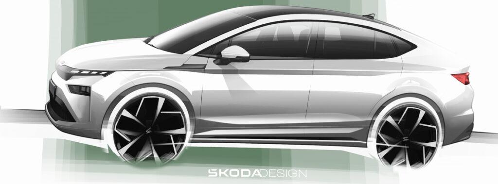 Na skicah zunanjosti novih modelov Enyaq in Enyaq Coupé je prikazan drzen, prenovljen sprednji del. V središču Škodinega oblikovalskega sloga Modern Solid je osvetljena tech-deck maska, ki nadomešča tradicionalno Škodino mrežo hladilnika. Deljena zasnova žarometov daje še večjo prefinjenost značaju vozila, saj se ožji zgornji del brez prekinitve nadaljuje v blatnike, ki jih dopolnjujejo drzni odbijači. Elementi v temnem kromu so vidni v napisu Škoda na pokrovu motornega prostora ter na spodnjih delih odbijačev in stranskih letvah. Poudarja jih ekskluzivna olibo zelena barva laka.