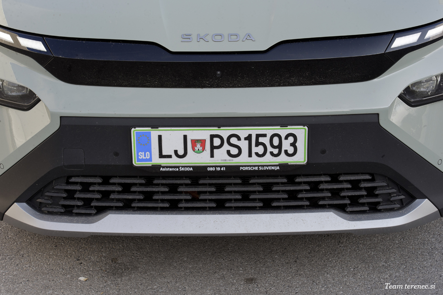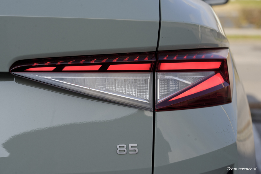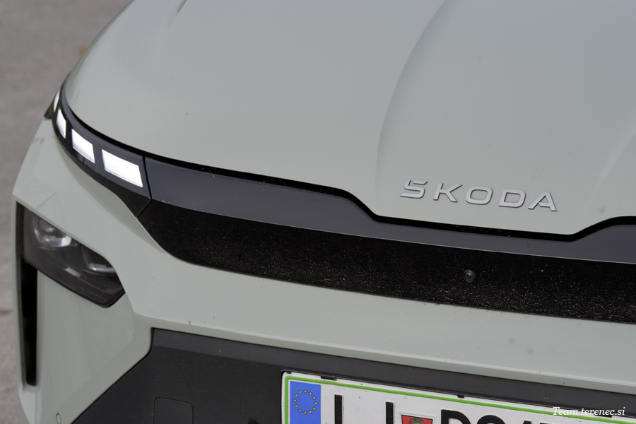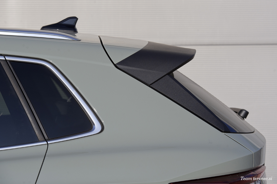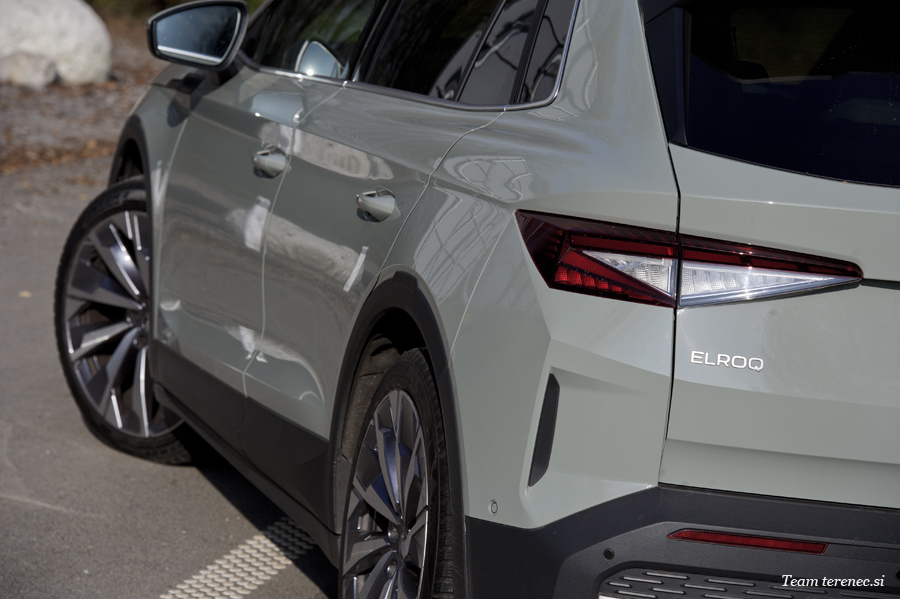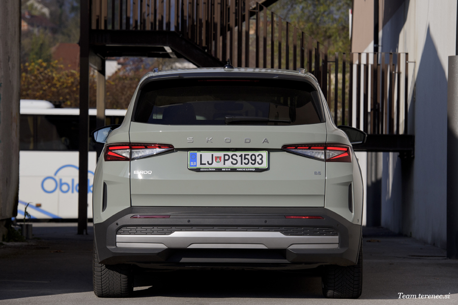 Na zadku model Elroq ohranja prepoznavno identiteto znamke z značilnimi C-oblikovanimi LED-lučmi. Te so povezane z vizualno širino zadka, kar daje vozilu bolj samozavesten nastop na cesti. Strešni spojler in difuzor dodatno prispevata k aerodinamiki, ne da bi delovala agresivno. Pomemben element je tudi nova tipografija napisa “Škoda” na zadku, ki nadomešča klasični logotip in poudarja sodobno, digitalno usmerjeno identiteto znamke.