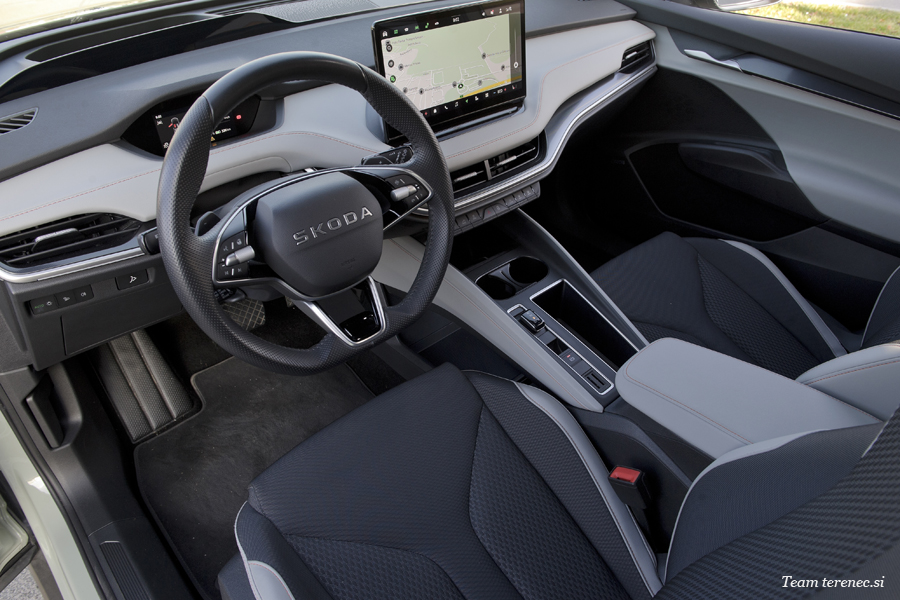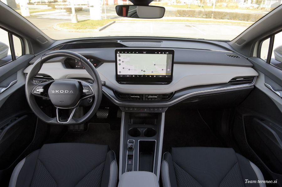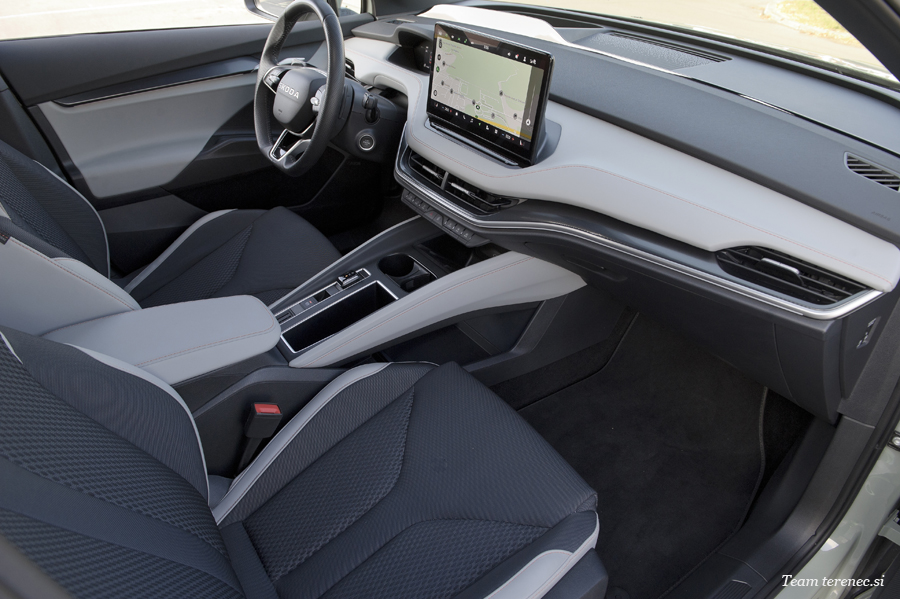 Ena izmed ključnih prednosti modela je prostornost glede na zunanje mere. Kabina ponuja dovolj prostora za družinsko uporabo, čeprav prtljažnik nekoliko zaostaja za večjim modelom Enyaq. Notranjost modela Škoda Elroq 85 sledi filozofiji z manj poudarka na prestižu ter več na uporabnosti, ergonomiji in trajnosti. Gre za kabino, ki na prvi pogled deluje umirjeno in znano, a skriva precej sodobne tehnologije.