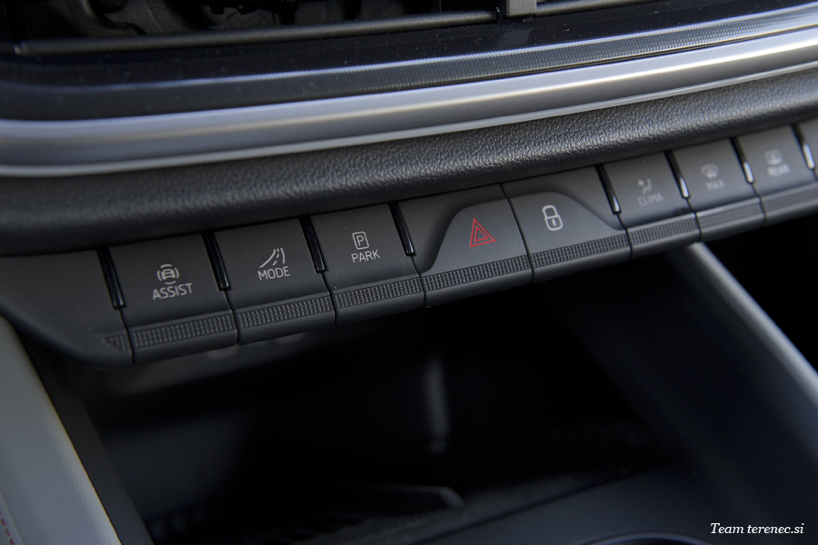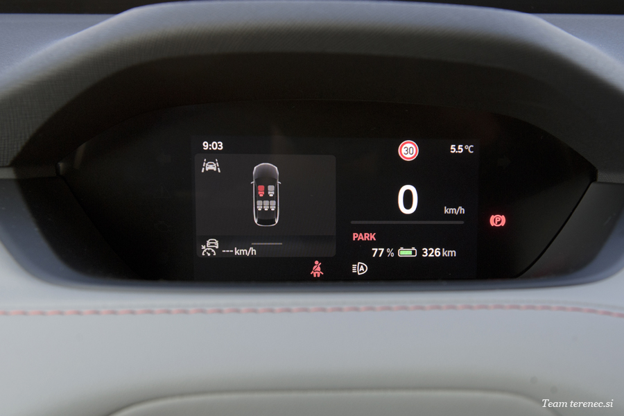 Armaturna plošča je oblikovana zelo čisto, brez odvečnih elementov. Pred voznikom je majhen digitalni zaslon velikosti 5 palcev, ki prikazuje ključne informacije, medtem ko osrednjo vlogo prevzame velik 13-palčni zaslon na sredini. Takšna postavitev sledi minimalistični logiki, da voznik vidi le bistveno, dodatne informacije pa so dostopne prek osrednjega sistema ali projicirane na head-up zaslonu na vetrobranskem steklu. Uporabniški vmesnik je sodoben in odziven, vendar zahteva nekaj privajanja, saj je večina funkcij integriranih v zaslon.