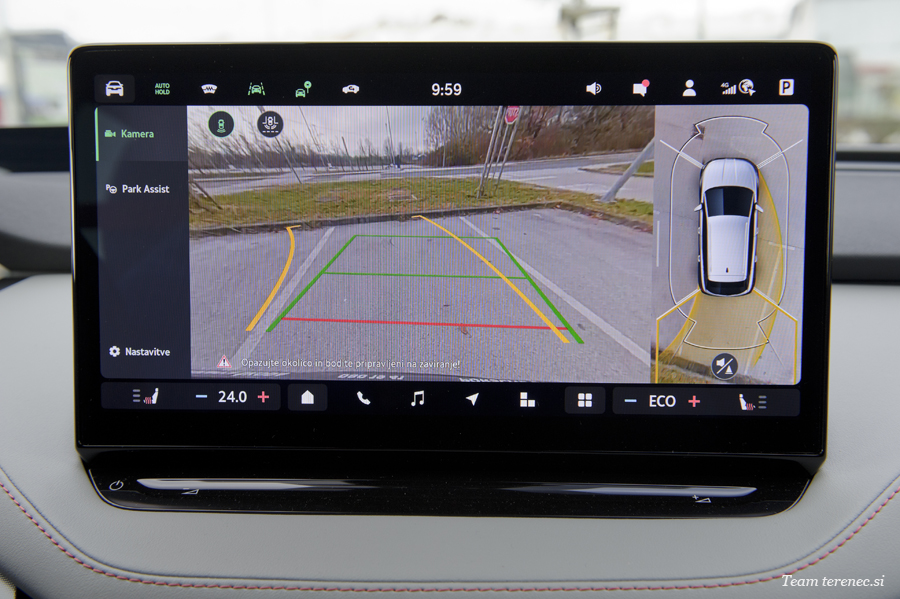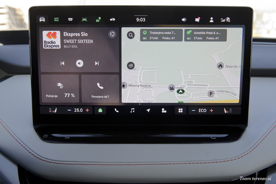 Ključno vlogo pa ima baterijski sklop. Elroq 85 je opremljen z litij-ionsko baterijo bruto kapacitete 82 kWh oziroma približno 77 kWh uporabne energije. Mi smo ga vozili v bolj hladnejšem času in s tem smo naredili manj kilometrov kot je obljubljeno po meritvah WLTP. V realnih razmerah to pomeni, da lahko vozniki brez večjih težav prevozi med 350 in380 kilometrov dosega, odvisno od načina vožnje in zunanjih pogojev.