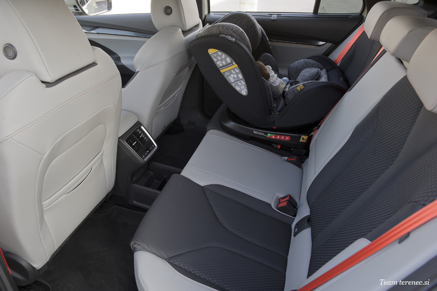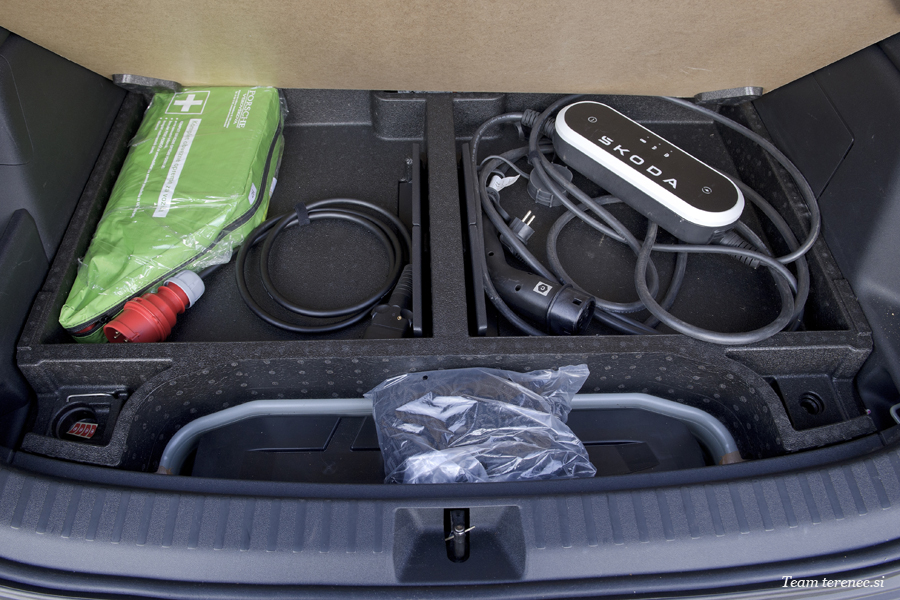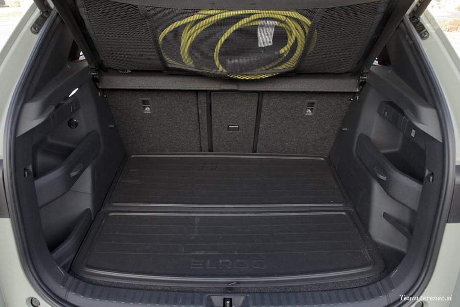 Elroq je nekoliko manj prostoren kot njegov večji brat model Enyaq, a kljub temu lahko ponudi še vedno dovolj prostora za potnike in prtljago. Zadnja klop je deljiva v razmerji 40:20:40, pod dnom prtljažnika najdemo se nekaj uporabnega prostora za shranjevanje polnilnega kabla, prve pomoči in še kaj. Kabel lahko shranimo tudi pod prtljažno polico, kar je redkost oziroma do sedaj tega še nismo videli. Prtljažnik ima pri normalni postavitvi 470 litrov prostora in se po podrtju zadnje klopi poveča na 1.580 litrov.