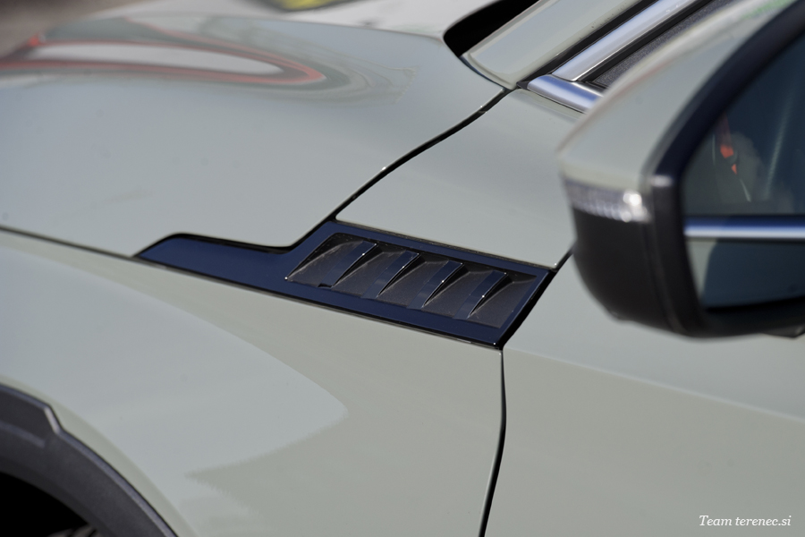 Stranski profil razkriva razmeroma kratki previsi, visoka linija oken in izraziti blatniki ustvarjajo občutek robustnosti. Linije so preproste, brez odvečnih okrasnih elementov, kar prispeva k brezčasnemu videzu. Aerodinamični detajli, kot so oblikovana platišča v velikosti 21 palcev (za doplačilo) in gladke površine, so podrejeni učinkovitosti.